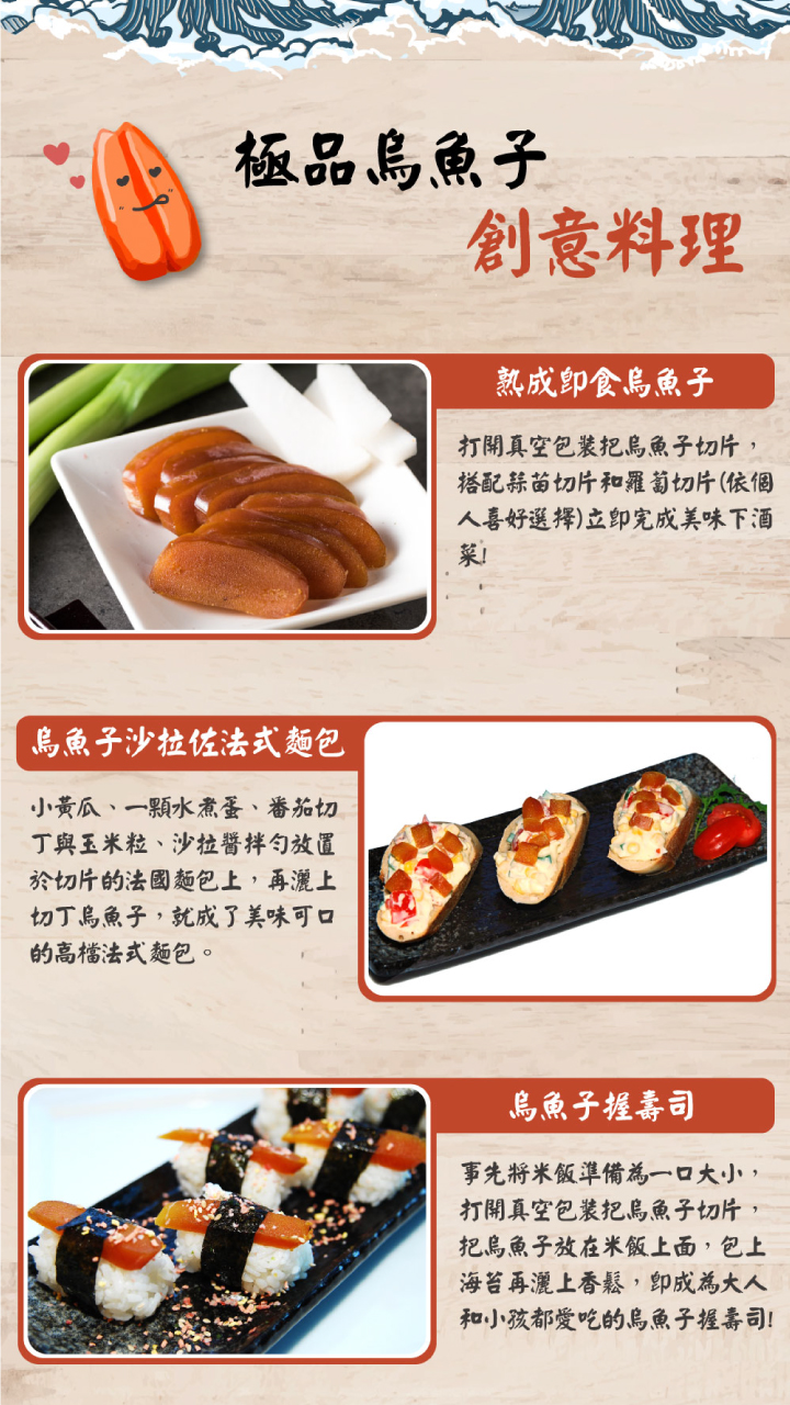 1.一口吃烏魚子,共有原味、起司、辣起司3種口味2.無倫是當作零食、下酒菜或是小點心,都非常適合3.小巧包裝,攜帶方便
