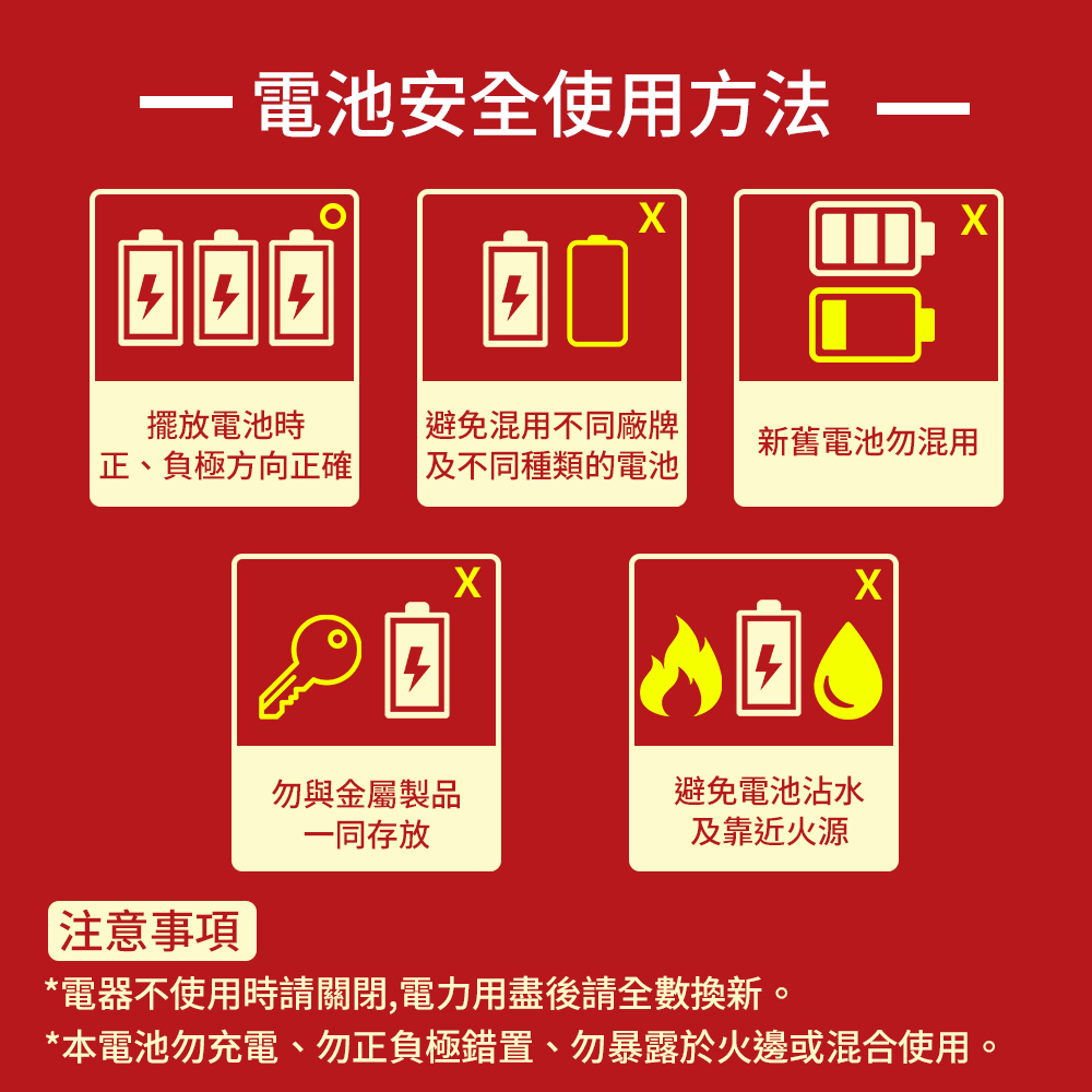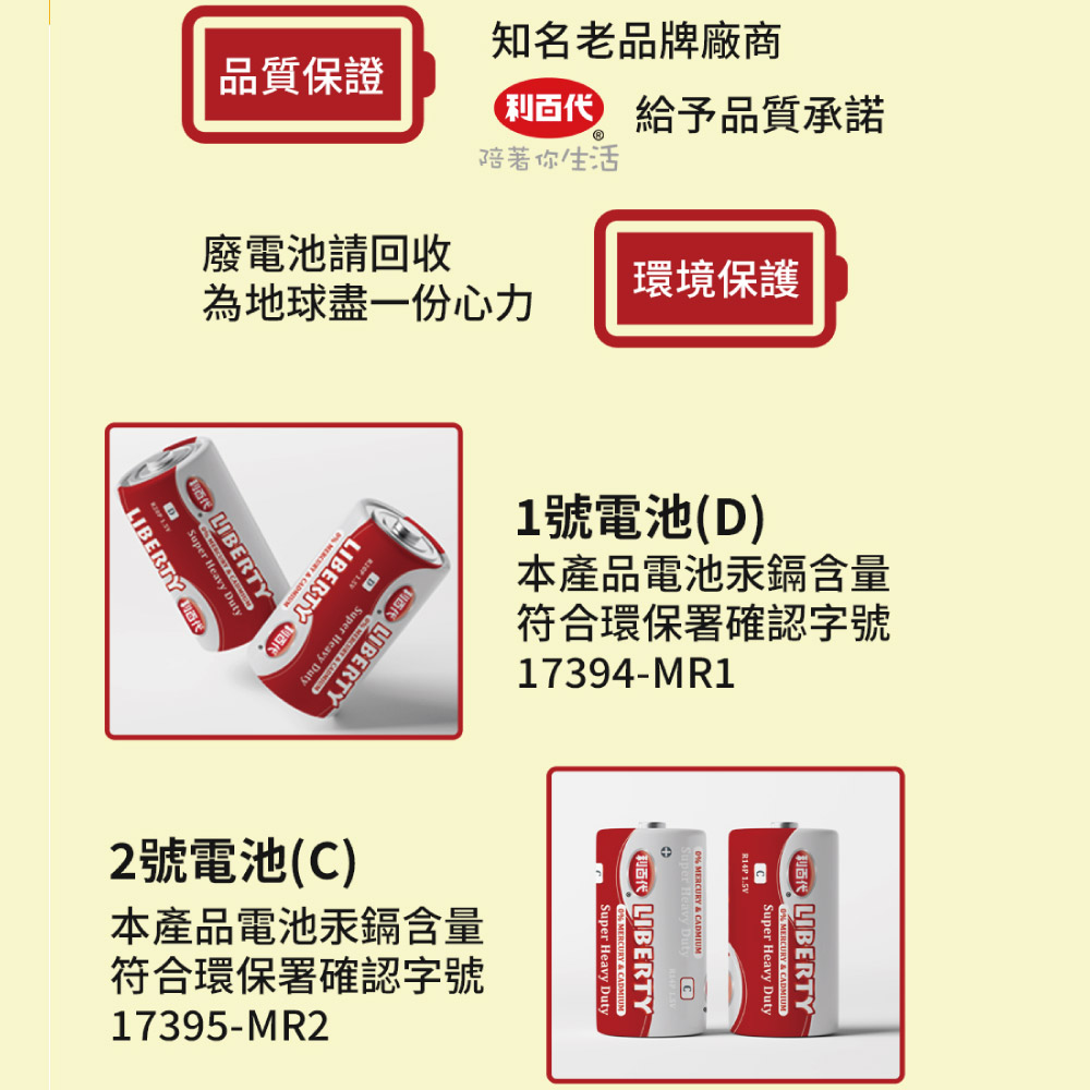 商品特色◆無汞環保碳鋅電池◆本電池汞含量符合環保署規定商品規格:◆規格:1號D碳鋅電池2入X10組◆電壓:1.5V◆成份:鋅筒、錳粉、碳棒◆產地:中國◆有效期限:3年◆環保字號:17394-MR1■本產品文案為原廠 / 代理商所提供,相關規格、保固與相關配件,若有錯誤依原廠 / 代理商公告跟實際出貨商品為準。※商品尺寸皆為平放測量以公分為單位※商品圖檔顏色因電腦螢幕設定差異會略有不同,以實際商品顏色為準,敬請見諒!※產品顏色會因網頁呈現而有些許色差,請已收到實品為準。