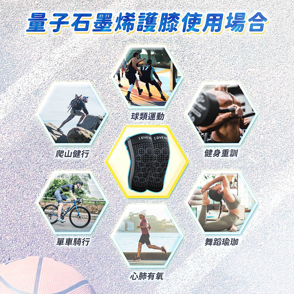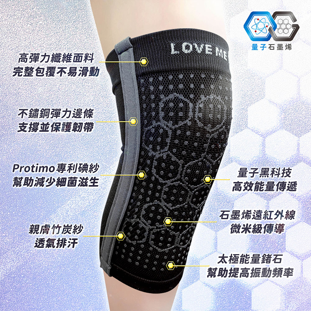 【商品特色】◉量子石墨烯黑科技遠紅外線能量傳遞,幫助提升膝蓋跟腿部肌肉的耐力與靈活度◉988顆太極能量鍺石+40個太極能量鍺蜂巢幫助提高振動頻率◉不鏽鋼彈力邊條支撐並保護韌帶,並可隨雙腿動作彎曲、活動自如◉萊卡面料完整包覆、不易鬆脫滑動◉親膚竹炭紗透氣排汗舒適,不易產生異味◉彈力纖維耐用且不易變形,適用不同體型◉Protimo專利碘紗幫助減少細菌滋生的發生率【商品規格】◉顏色:黑◉材質:聚酯纖維85% (內含墨烯、能量鍺、竹炭紗)、彈性纖維15%◉尺寸:FREE SIZE (適用膝圍 26 - 46 cm)◉保存期限:10年◉產地:台灣【洗滌方式】◉適宜手洗,請使用中性洗劑,避免溫水洗滌、浸泡◉勿使用漂白水、柔軟精清洗,其成分會破壞抗菌纖維◉置於陰涼通風處晾乾,避免太陽曝曬◉切勿烘乾或吹風機熱吹乾、熨燙及乾洗【溫馨提醒】◉兩側用來保護韌帶用的不鏽鋼彈力邊條為金屬,請避免穿著護膝過機場安檢,也請不要讓7歲以下的孩童單獨使用。◉七天鑑賞期為猶豫期非試用期,商品須在完整、未使用,並且可以恢復原包裝的狀況下,才能進行退換貨。