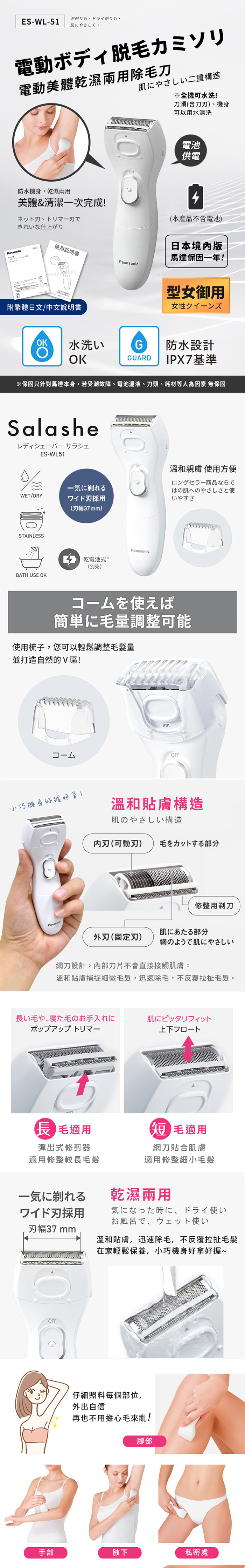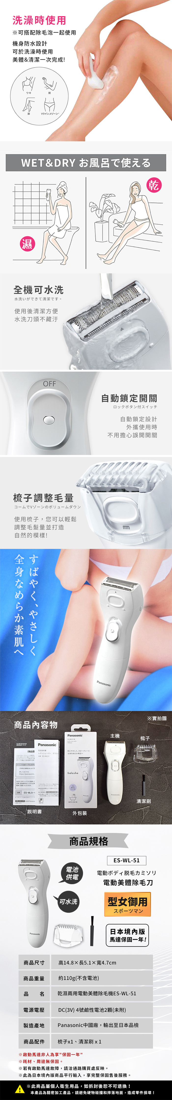 【日本國際牌Panasonic】乾濕兩用電動美體除毛機 除毛刀 得體刀(全機可水洗)附清潔刷
