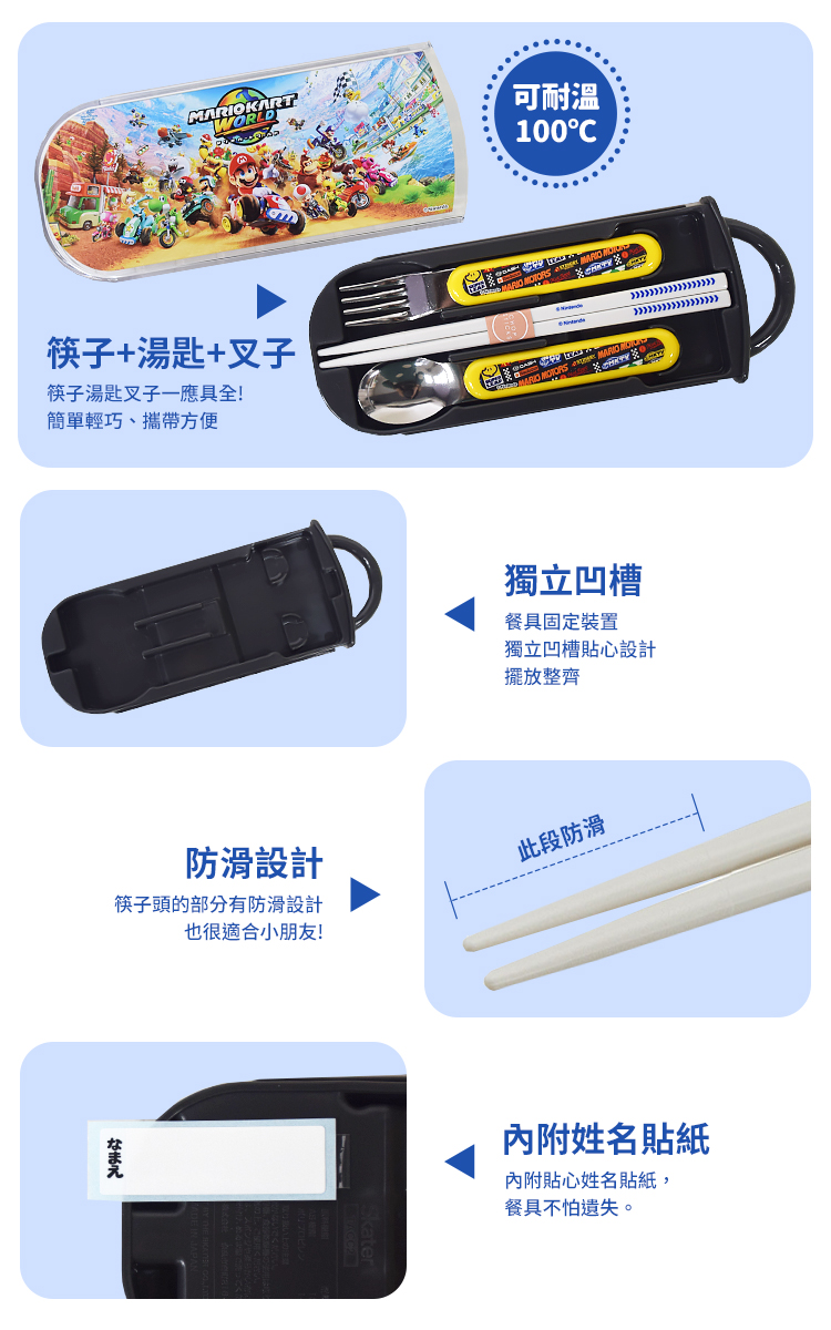 ●筷子湯匙叉子 一應具全●內附姓名貼紙,不怕遺失餐具●滑蓋式設計,收納方便,簡約輕巧●筷子頭的部分有防滑設計,方便夾取食物!