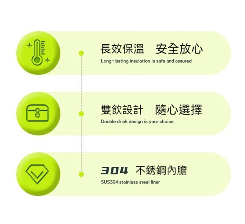 容量:900ml尺寸:9*24cm重量:472g材質:304不銹鋼內膽產地:中國注意事項:•使用前,請用食品級清潔劑以軟質海綿清洗乾淨再使用。•請勿盛裝酸性飲料,以免腐蝕產品。•本產品若掉落地面或遭強力碰撞,可能導致破裂,請小心使用。•盛裝飲品時,水量請勿過滿以免導致溢出。•商品請避免直接加熱或高溫消毒,以免損壞。•如長時間不使用,請清洗乾淨並擦乾置於通風處收放。•避免強力拉扯提把,提把僅作為輕便用途,避免用力拉扯或承受過大壓力,以防止斷裂或損壞。