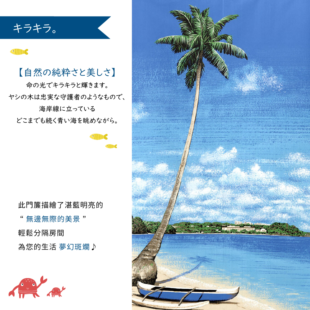 日本製【コスモ】長門簾《棕櫚海灘》自然にあふれた風景や外国の街並み、世界遺産などを取り揃えた『風景のれん』シリーズ。自然豊かなデザインは癒しの空間に。海外の庭園や風景、世界遺産のデザインは旅行気分に。 縦にストライプ状のレース編模様がある、編みレース生地を使用。レース生地の中でもしっかりとした生地ですので反対側がシルエット調に見えるくらいの透け感があります。 『暖簾の使い方はいろいろ』アパートの玄関を開けた時に室内が見えないように。ドアが無い空間の間仕切りに。収納棚の目隠しに。壁に掛けてポスターやタペストリーのように。空/海/ヤシ/癒し/夏 【風景親善】系列以豐富的自然景觀、外國城市景觀、世界遺產等為特色。「風景門簾」系列,以自然山水、異國都市風景、世界遺產等為主題,充滿自然氣息的設計,打造療癒空間。蕾絲布料製成,具有垂直條紋蕾絲編織圖案,是最堅固的蕾絲布料之一,因此另一面看起來像剪影一樣透明,因此另一面看起來像剪影。,作為無門空間的隔間。 生產國:日本材質/成分:100%聚酯纖維包裝:獨立袋包裝尺寸:約85 公分(寬)x 150 公分(長)國際條碼:4943741954323出貨:門簾*1件清洗方式:可水洗、不可漂白、不可烘乾顏色:如圖,網頁產品因拍攝與各顯示器顯色不同關係,與實品略有差異, 此商品圖為參考用之情境圖示,產品內容以規格敘述內容為準適用:臥室門、廚房門、浴室門、衣櫥、玄關入口...等 【注意事項】伸縮桿需自備,商品內容為門簾本體並無附桿子