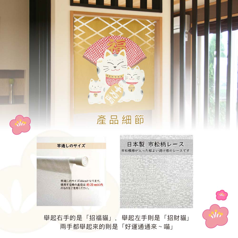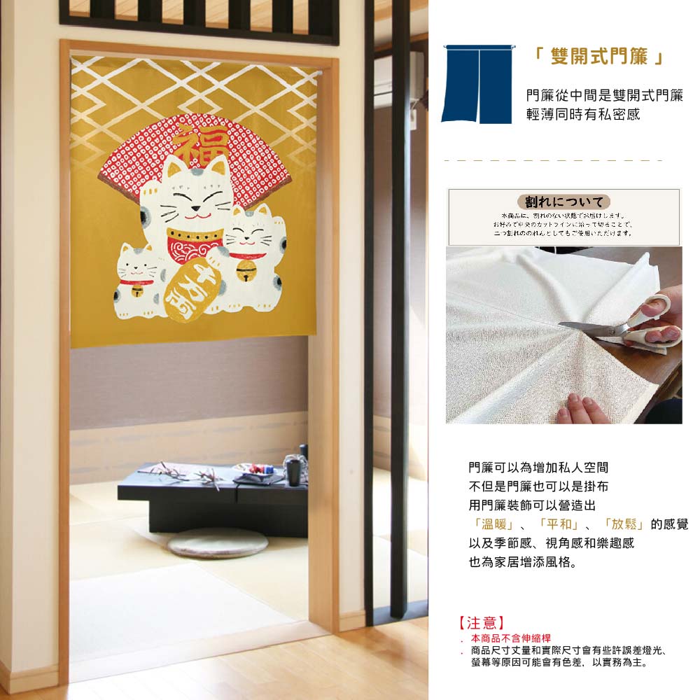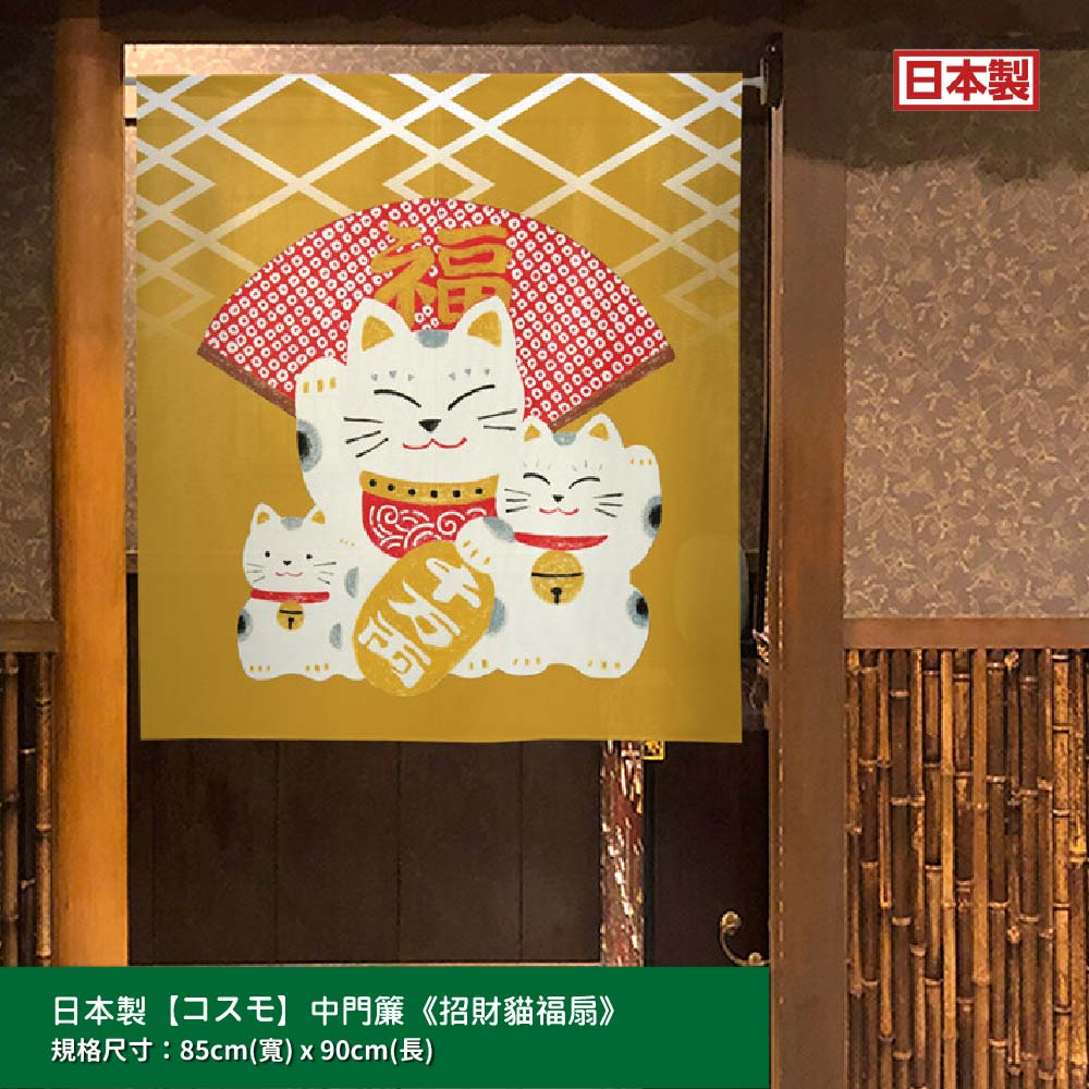 日本製【コスモ】中門簾《招財貓福扇》幸運黃