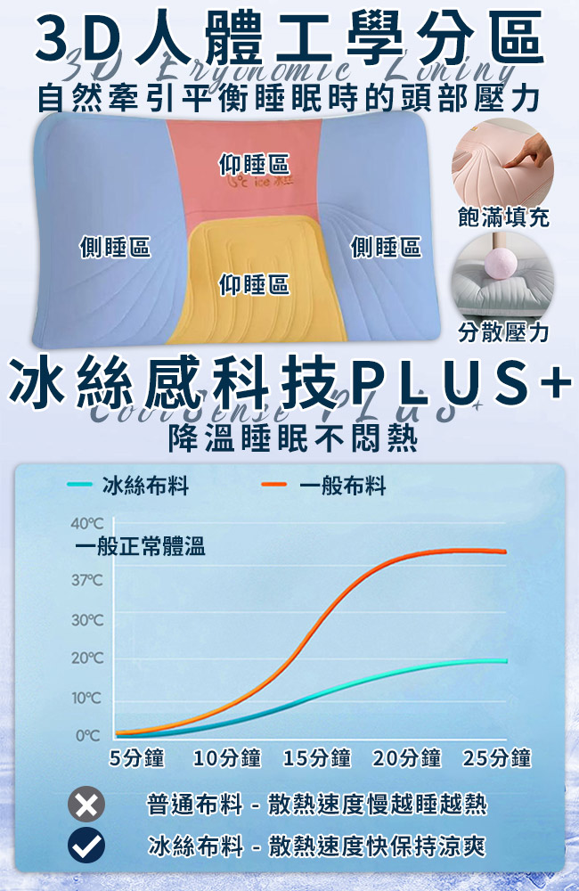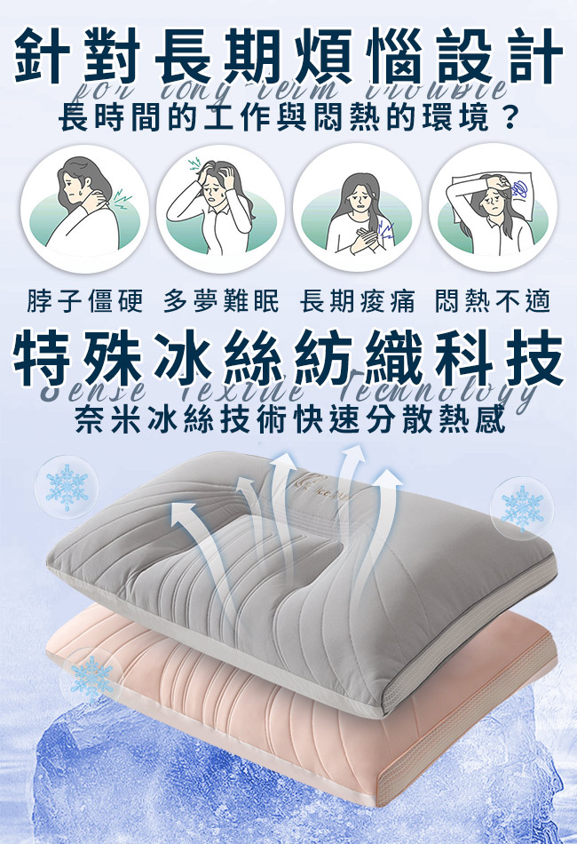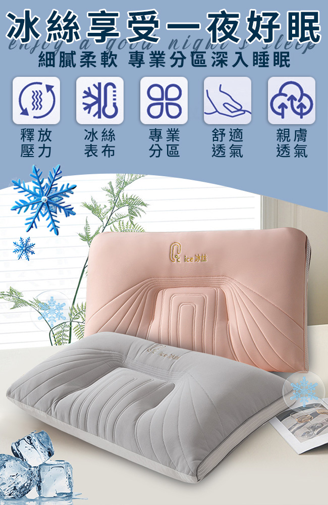 ◆特殊冰絲紡織科技,享受一夜好眠◆冰絲感舒適,會呼吸的枕頭◆3D人體工學分區,牽引人體平衡睡眠壓力◆完整支撐頭頸部,睡眠無壓迫感改善睡眠,養護頸椎◆釋放壓力的專家枕讓您天天都舒壓好眠!◆特殊設計穩定支撐頭及頸部壓力,改善打呼狀況!
