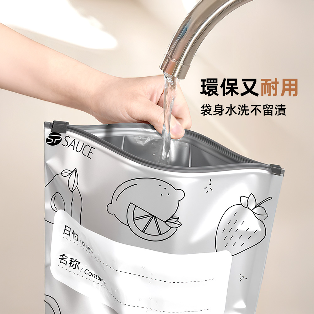 這款保鮮密封袋,拉鍊式設計輕鬆開合,內層隔氧隔光,有效延長保鮮時間。袋身可水洗重複使用,環保耐用,底部加寬能直立收納,放入冰箱更整齊。小號適合餅乾果乾,大號則能裝冷凍肉類或大量蔬果,一袋多用,日常保存更省心。