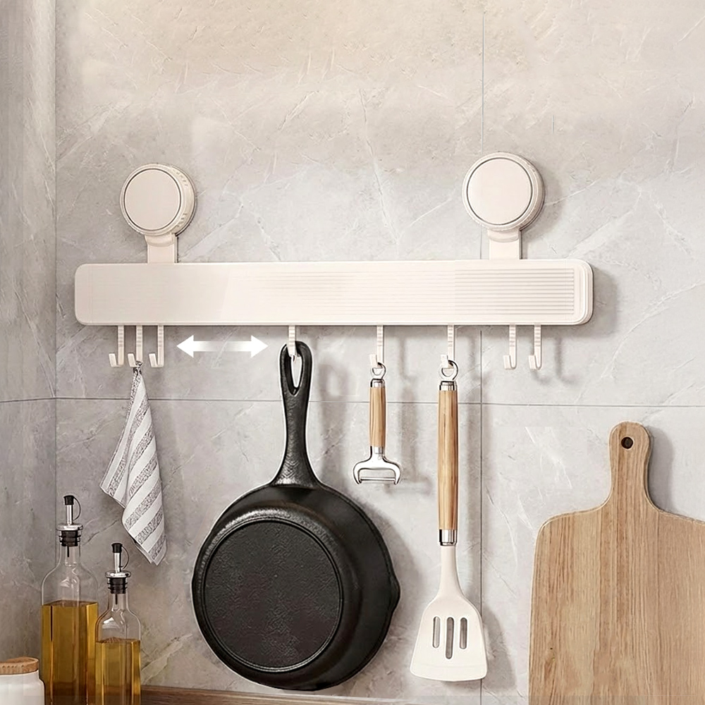 這款廚房吸盤掛鉤採用吸盤式安裝,不需鑽孔、不傷牆面,一按即可牢牢吸附。40cm 橫向空間搭配可左右滑動的掛鉤,能依器具大小自由調整距離,鍋具掛滿也不擁擠。需要清潔時整組可快速拆卸,油漬灰塵一擦就乾淨,讓廚房保持俐落有序。