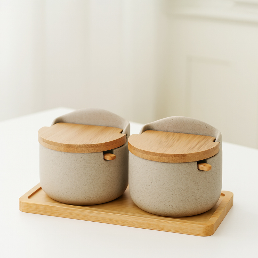 雙罐搭配竹木底座,造型簡約而穩重。罐身具凹槽設計,附小勺方便取用調味料不凌亂。每罐約可容納350–400g粉料或顆粒類調味品,容量充足。另附標籤貼紙與筆,可依需求標記內容,整潔有序。表面光滑細膩,不易殘留異味,適合擺放於廚房、餐桌或辦公室茶區。