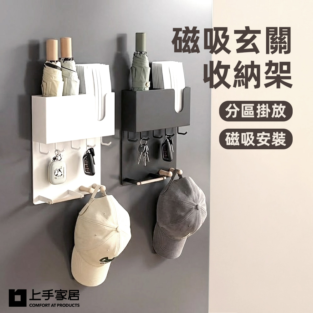 這款磁吸玄關收納架結合置物盒、掛鉤與掛桿設計,將常用隨身物分區收納,回家順手放、出門一眼就找得到。背面磁貼固定,無需鑽孔即可安裝,不破壞門片或牆面,讓玄關空間維持整齊好走動。