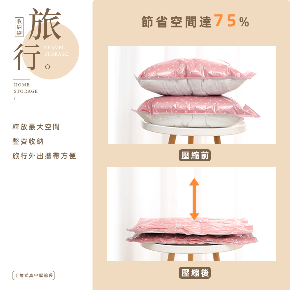不必帶抽氣機、不靠電,純手捲也能快速排氣壓縮。旅遊、出差、露營都適用,讓你帶更多、行李卻更輕鬆。