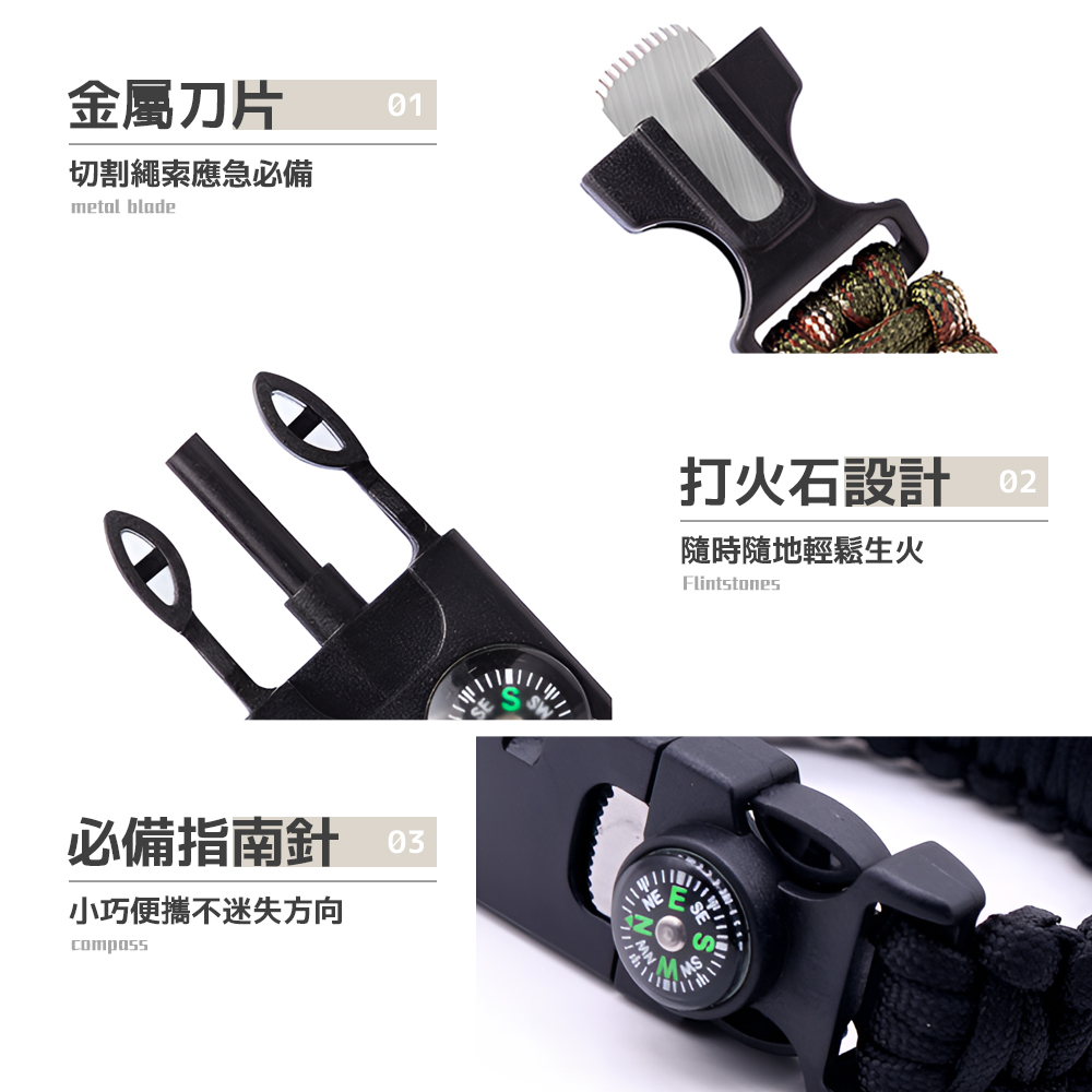 這款五合一傘繩求生手環特別適合戶外活動愛好者,將指南針、打火石、口哨、傘繩及小刀片整合於腕間,解決了野外迷途、生火困難或需要緊急信號的困擾。它不僅是帥氣的配件,更是輕巧的求生工具組,讓你隨時做好準備,從容應對各種突發狀況。