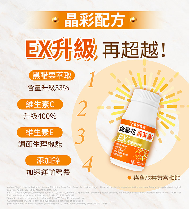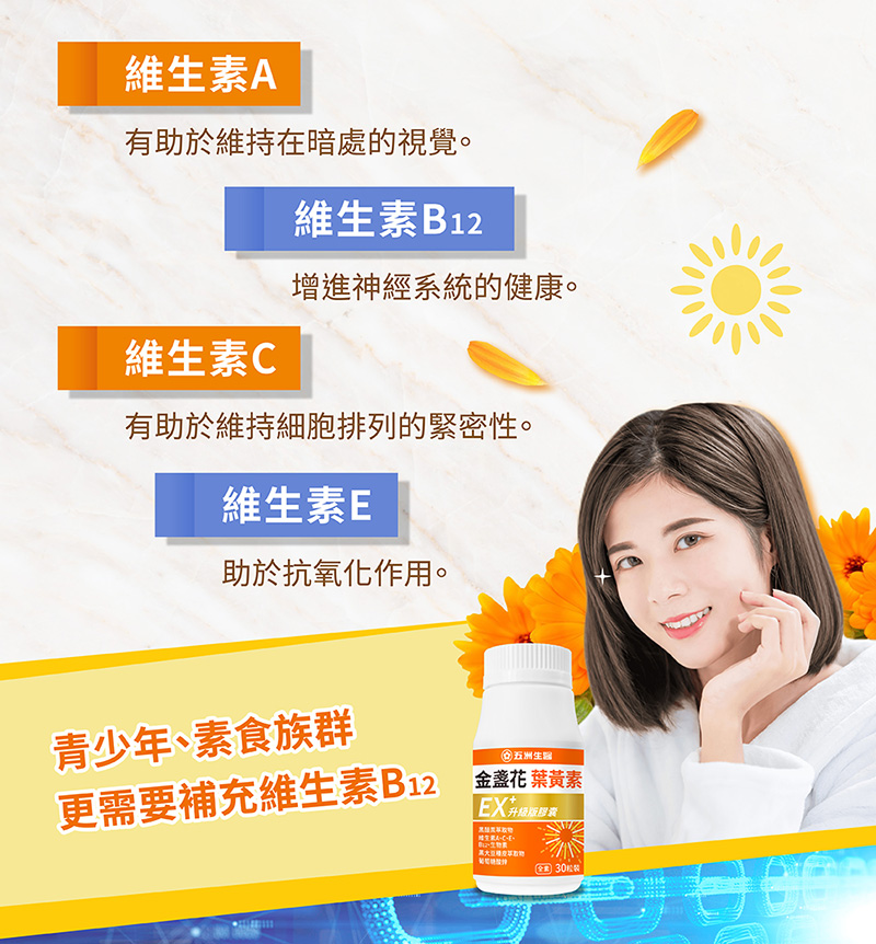 ◉商品成份:金盞花萃取物【微結晶狀α-纖維素、金盞花萃取物(含葉黃素脂、玉米黃素)、羥丙基甲基纖維素、維生素E(抗氧化劑)】、膠囊(羥丙基甲基纖維素、純水、鹿角菜膠、食用紅色六號、二氧化鈦、氯化鉀、食用藍色一號)、黑醋栗萃取物、維生素C、葡萄糖酸鋅、二氧化矽、維生素E 50%(維生素E、葡萄糖漿、辛烯基丁二酸鈉澱粉、二氧化矽)、黑大豆種皮萃取物、醋酸維他命A【麥芽糊精、玉米澱粉、阿拉伯膠、醋酸維生素A、維生素E(抗氧化劑)】、脂肪酸甘油酯、維生素B12 0.1%(麥芽糊精、檸檬酸鈉、檸檬酸、維生素B12)、生物素