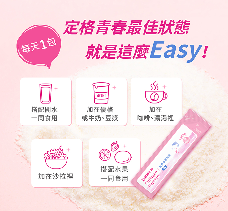 ◉食用方式:一日1次,一次1-2包,可直接倒入杯中,搭配開水或果汁、咖啡、牛奶飲用。