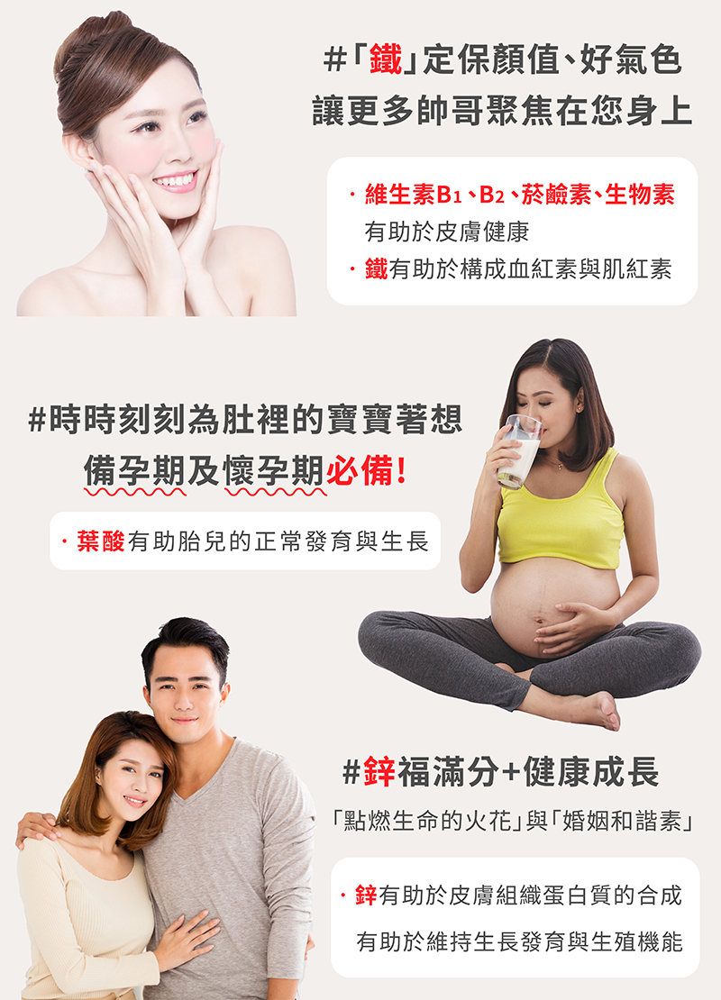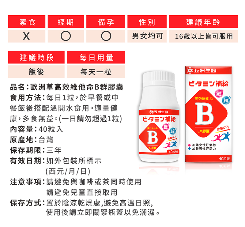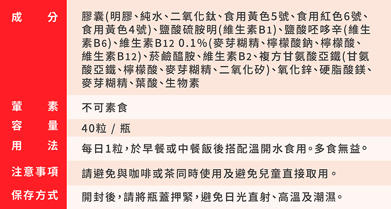 ◉商品成份:膠囊(明膠、純水、二氧化鈦、食用黃色5號、食用紅色6號、食用黃色4號)、鹽酸硫胺明(維生素B1)、鹽酸吡哆辛(維生素B6)、維生素B12 0.1%(麥芽糊精、檸檬酸鈉、檸檬酸、維生素B12)、菸鹼醯胺、維生素B2、複方甘氨酸亞鐵(甘氨酸亞鐵、檸檬酸、麥芽糊精、二氧化矽)、氧化鋅、硬脂酸鎂、麥芽糊精、葉酸、生物素。