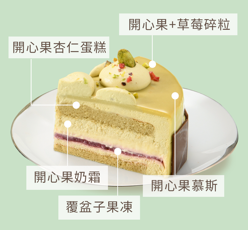 開心果杏仁蛋糕/開心果慕斯/覆盆莓庫利/開心果白巧克力淋面/開心果草莓碎粒