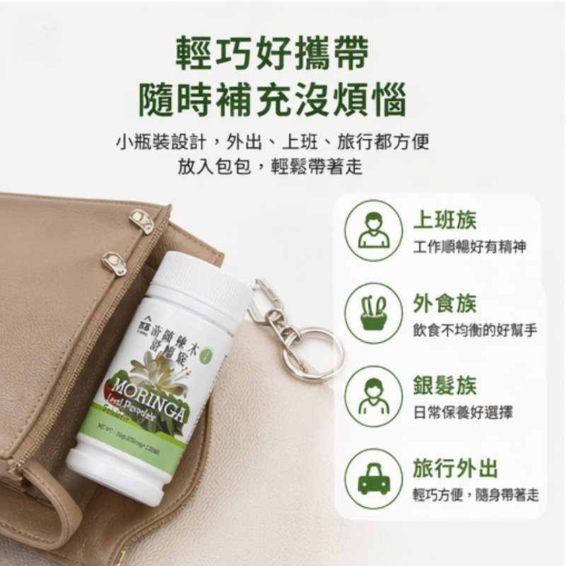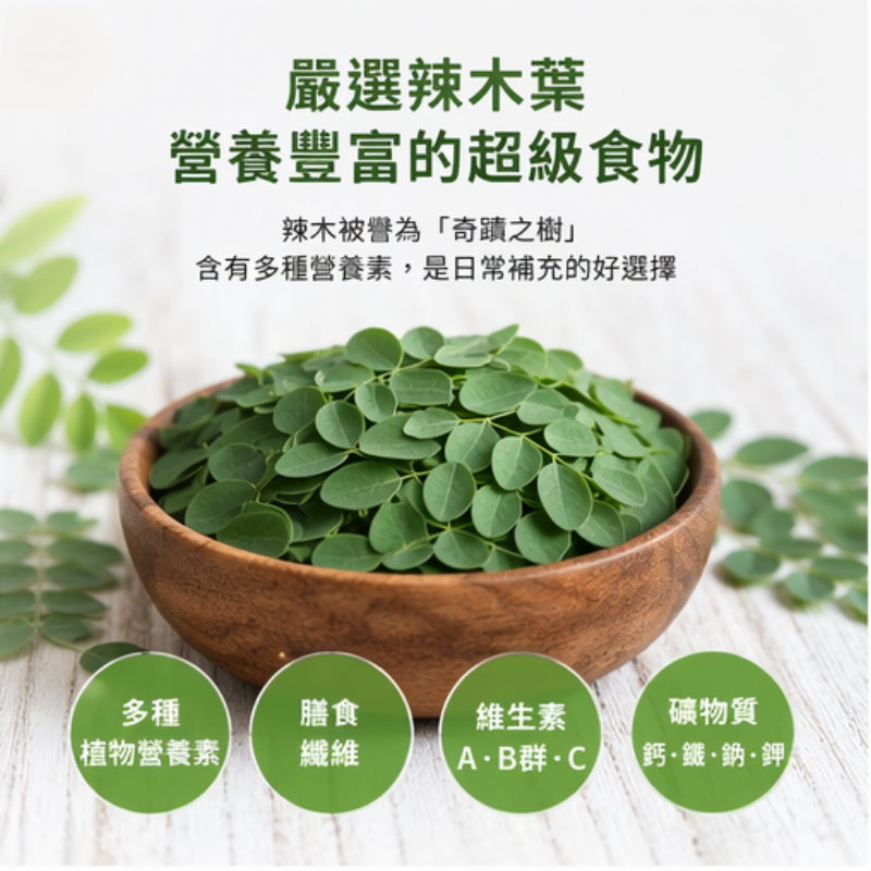 奇蹟辣木MORINGA 它也被稱為奇蹟樹,它是一種含有90多種營養素 和超過46種抗氧化劑的 超 級 食 物!!! 辣木不僅全株可食,「辣木葉」中更含有豐富的維生素 B 群、 A、C,礦物質如鉀、鈣、鐵、鎂、硒、鋅,以及多酚類和類黃酮等抗氧化物。此外,辣木還具有人體無法自行製造,須藉由飲食才能攝取到的其中八種必需胺基酸,也是素食者補充蛋白質的優良選擇之一。奇蹟 辣木舒暢錠採用辣木葉粉+綜合消化分解酵素+綜合蔬果酵素粉,促進腸道蠕動,使糞便比較柔軟而易於排出。維持消化道機能,改變細菌叢生態,營養價值高,通過SGS檢驗無重金屬、無農藥殘留,是全家大小養生保健的好產品!※全素可食,素食者的最佳營養補給!