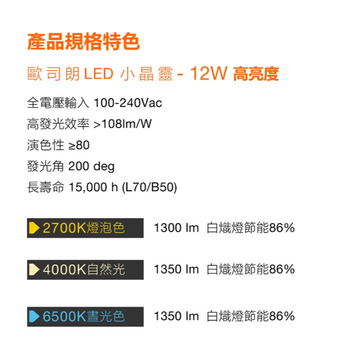 色溫 2700K黃光/4000K自然光/6500K白光