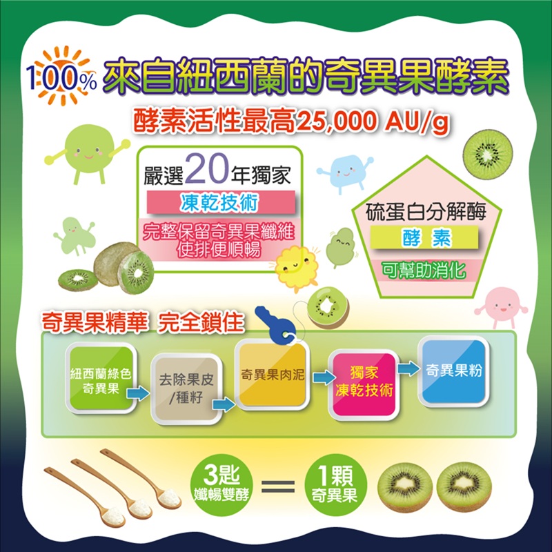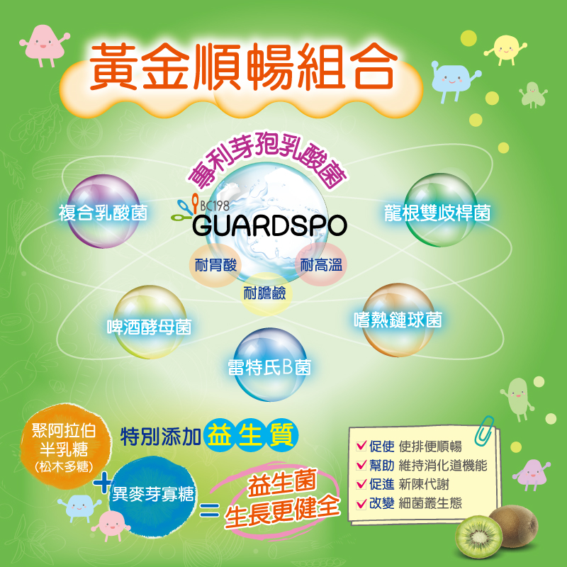 ✔嚴選專利芽孢乳酸菌,耐酸、耐鹼、耐高溫。✔搭配多元優質好菌和益生質,為您的健康層層把關。✔添加天然綜合蔬果酵素和奇異果酵素,食物分解更完全,幫助維持消化道機能,使排便順暢。✔全家大小都適合,是健康維持的營養補助食品。✔本品若有破損或完封不良,請勿食用。