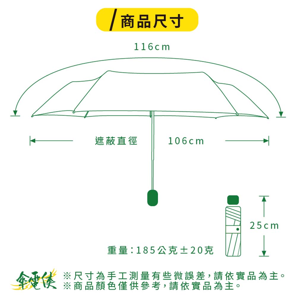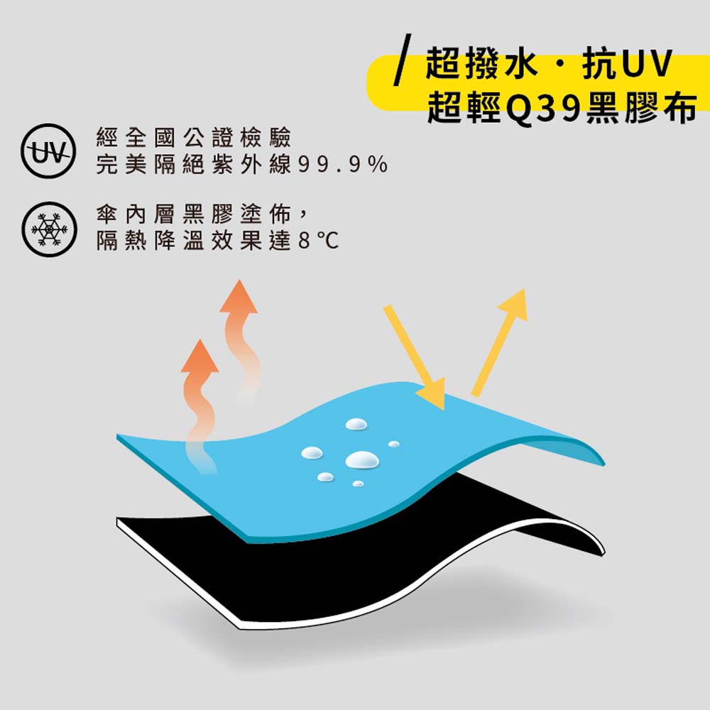 ☂️【商品特色】⚡️本賣場皆為現貨,無需長期等待⚡️高效四級潑水Q39輕量黑膠亞光布隔絕紫外線效果達99.9%傘下隔熱降溫達8°C傘布經過全國公證檢驗和紡織研究所品質有保證⚡️台灣專利下拉卡式防夾手設計⚡️防水木耳花+仿皮紋握把, 小細節質感再升級⚡️三節式超輕黑電著全鋁中棒,耐鏽好推收⚡️中尾段高強度超輕量碳纖維支骨,強韌耐風不易斷裂☂️【詳細規格】⚡傘骨:58X6K 鋁+碳纖骨⚡傘布:99.9%抗紫外線 降溫8度 Q39輕量亞光布⚡重量:185公克±10克⚡收合長度:25cm⚡展開直徑:106cm☂️【運送資訊】服務營業時間為週一至週五 9:00~12:00 13:00~17:00每週六及週日暫停出貨☂️【終身維修】傘電俠的商品均享有終身維修的服務,但因需更換的零件不同,我們會請專業維修人員一雨傘的實際狀況評估是否需要酌收更換零件的材料費用,我們會與您報價後,您再決定是否要維修。☂️【注意事項(退換貨/FAQ)】🔸傘電俠的商品都是原廠,提供優質雨具,有任何問題歡迎聊聊~🙋🏻♀️(收到商品後有疑問可以先聊聊,讓小編協助一起了解商品狀況,不要隨意退貨喲!><)<br>🔹下單後會盡量在3日內出貨,請大家也要記得取貨呦📦🔸收到商品有任何問題或需要維修服務可聯絡我們,若喜歡我們的商品,也歡迎留下您的好評👏🏻🔹六日與國定假日不營業,其餘上班時間會盡快處理訂單跟回覆訊息✉️🔸為保障彼此權益,拆封時請全程錄影,若商品有問題須於三日內提供全程錄影檔,逾期恕無法受理!🔹收到商品後所有任何瑕疵狀況,請於收到貨品後3日內提出(請保持商品在全新的狀態且包裝/吊牌完整,否則無法受理),如需退貨「請勿按完成訂單」,「按退貨選項即可完成退貨」🔸請正確使用雨傘以延長傘的使用壽命,淋雨後請務必撐開放置陰涼處陰乾。維修服務、正確使用/保養方式,請詳讀說明書。🔹尺寸皆為手工測量,會有些許差距。商品顏色會因每個螢幕顯示不同而有些許色差,若會介意下單前請三思。