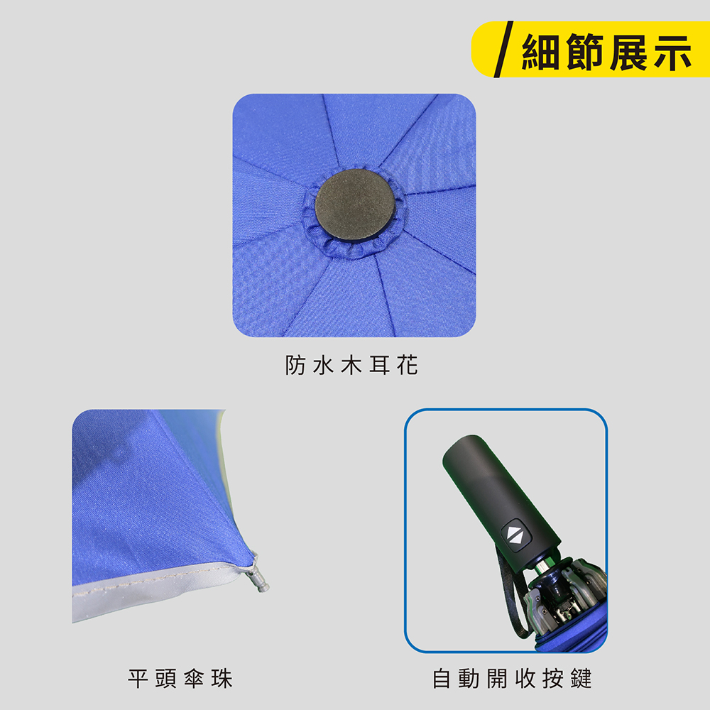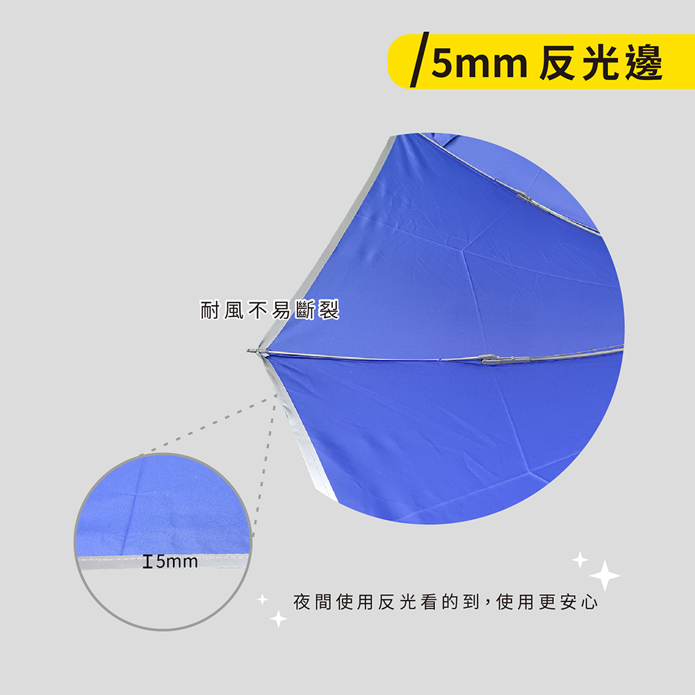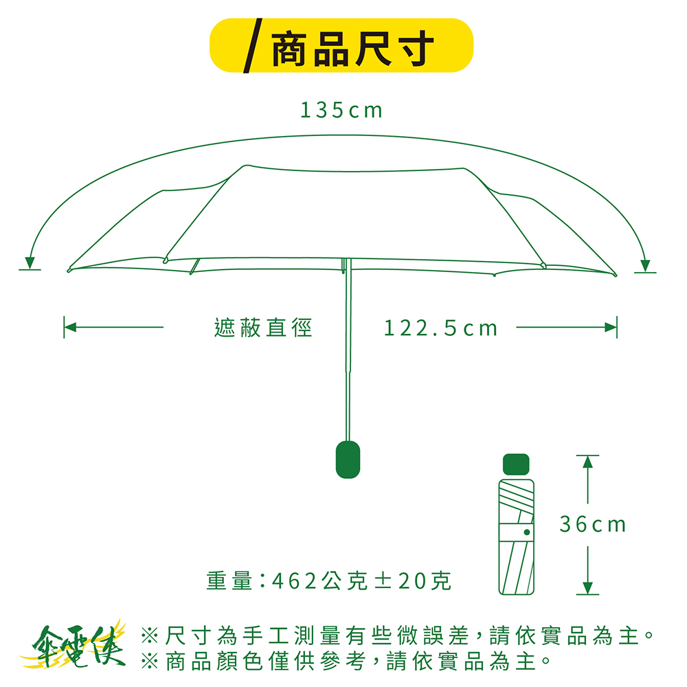 ☂️【商品特色】⚡本賣場皆為現貨,無需長期等待⚡超潑水PG傘布隔絕紫外線效果達95.5%傘下隔熱降溫達8°C傘布經過全國公證檢驗和紡織研究所品質有保證⚡5mm反光包邊,夜間步行好安心⚡防暴衝中棒設計,收傘不用練武功⚡鉻色鐵中棒,耐鏽好推收⚡中尾段玻纖支骨,耐風不易斷☂️【詳細規格】⚡傘骨:70X8K鐵鋁+FRP玻纖骨⚡傘布:95.5%抗紫外線 超潑水府綢布⚡重量:462±20克⚡收合長度:36cm⚡展開直徑:119cm☂️【運送資訊】服務營業時間為週一至週五 9:00~12:00 13:00~17:00每週六及週日暫停出貨☂️【終身維修】傘電俠的商品均享有終身維修的服務,但因需更換的零件不同,我們會請專業維修人員一雨傘的實際狀況評估是否需要酌收更換零件的材料費用,我們會與您報價後,您再決定是否要維修。☂️【注意事項(退換貨/FAQ)】🔸傘電俠的商品都是原廠,提供優質雨具,有任何問題歡迎聊聊~🙋🏻♀️(收到商品後有疑問可以先聊聊,讓小編協助一起了解商品狀況,不要隨意退貨喲!><)<br>🔹下單後會盡量在3日內出貨,請大家也要記得取貨呦📦🔸收到商品有任何問題或需要維修服務可聯絡我們,若喜歡我們的商品,也歡迎留下您的好評👏🏻🔹六日與國定假日不營業,其餘上班時間會盡快處理訂單跟回覆訊息✉️🔸為保障彼此權益,拆封時請全程錄影,若商品有問題須於三日內提供全程錄影檔,逾期恕無法受理!🔹收到商品後所有任何瑕疵狀況,請於收到貨品後3日內提出(請保持商品在全新的狀態且包裝/吊牌完整,否則無法受理),如需退貨「請勿按完成訂單」,「按退貨選項即可完成退貨」🔸請正確使用雨傘以延長傘的使用壽命,淋雨後請務必撐開放置陰涼處陰乾。維修服務、正確使用/保養方式,請詳讀說明書。🔹尺寸皆為手工測量,會有些許差距。商品顏色會因每個螢幕顯示不同而有些許色差,若會介意下單前請三思。