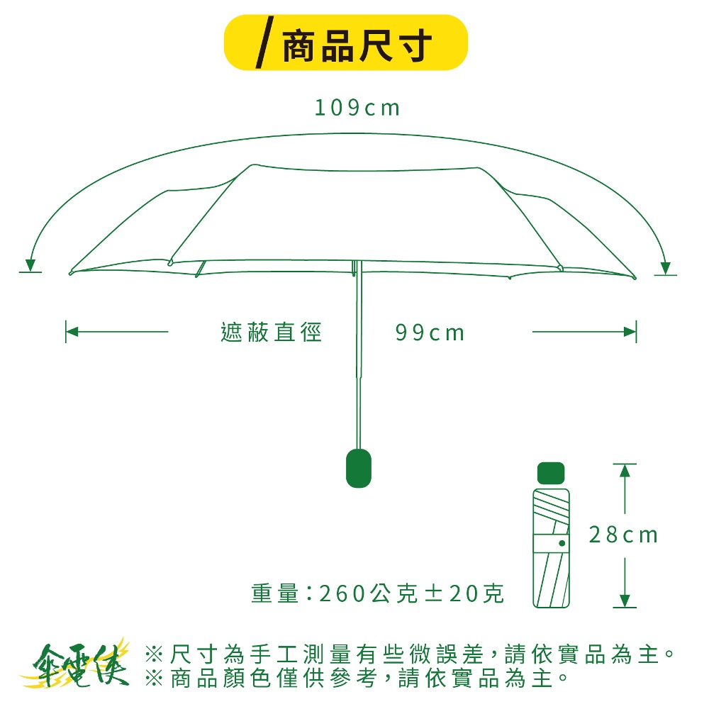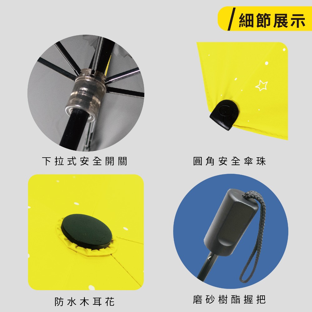 ☂️【商品特色】⚡️本賣場皆為現貨,無需長期等待⚡️ 高效5級撥水度 府綢黑膠布隔絕紫外線效果達99.9%傘布經過全國公證檢驗和紡織研究所品質有保證⚡️直覺下拉式開關設計,不怕夾傷手⚡️三節式輕量鐵鋁中棒,堅固耐鏽好推收⚡️中尾段玻纖支骨、彈性佳、耐風不易斷⚡️傘珠"寬扁圓角"設計,使用安全不怕在人群中,戳傷自己/路人⚡️跟著可愛的迷航外星人去探索宇宙吧!!!☂️【詳細規格】⚡傘骨:55X6K鐵鋁+FRP玻璃纖維⚡傘布:99.9%抗紫外線 府綢黑膠布 降溫8度⚡重量:260±20克⚡收合長度:28cm⚡展開直徑:99cm☂️【運送資訊】服務營業時間為週一至週五 9:00~12:00 13:00~17:00每週六及週日暫停出貨☂️【終身維修】傘電俠的商品均享有終身維修的服務,但因需更換的零件不同,我們會請專業維修人員一雨傘的實際狀況評估是否需要酌收更換零件的材料費用,我們會與您報價後,您再決定是否要維修。☂️【注意事項(退換貨/FAQ)】🔸傘電俠的商品都是原廠,提供優質雨具,有任何問題歡迎聊聊~🙋🏻♀️(收到商品後有疑問可以先聊聊,讓小編協助一起了解商品狀況,不要隨意退貨喲!><)<br>🔹下單後會盡量在3日內出貨,請大家也要記得取貨呦📦🔸收到商品有任何問題或需要維修服務可聯絡我們,若喜歡我們的商品,也歡迎留下您的好評👏🏻🔹六日與國定假日不營業,其餘上班時間會盡快處理訂單跟回覆訊息✉️🔸為保障彼此權益,拆封時請全程錄影,若商品有問題須於三日內提供全程錄影檔,逾期恕無法受理!🔹收到商品後所有任何瑕疵狀況,請於收到貨品後3日內提出(請保持商品在全新的狀態且包裝/吊牌完整,否則無法受理),如需退貨「請勿按完成訂單」,「按退貨選項即可完成退貨」🔸請正確使用雨傘以延長傘的使用壽命,淋雨後請務必撐開放置陰涼處陰乾。維修服務、正確使用/保養方式,請詳讀說明書。🔹尺寸皆為手工測量,會有些許差距。商品顏色會因每個螢幕顯示不同而有些許色差,若會介意下單前請三思。