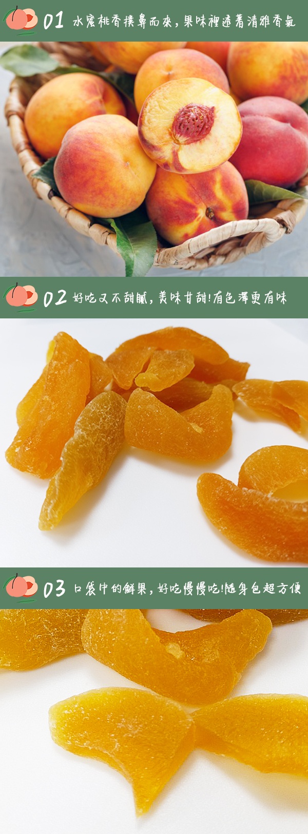 穿梭於果片中的水分!💦 隨子桃子的香氣融入你的味蕾裡!😋 覺得生活總是太無趣?? 讓甜甜的水蜜桃乾來填補這些縫隙🍑 由充足陽光+適宜氣候所孕育出來的大鮮桃 桃味更濃郁!恰恰好的甜度、高顏值的果乾 長時間低溫烘培乾燥技術 保留百分百的新鮮原味~100% 口感絕佳讓人唇齒留香~ 一口咬下就能吃出鮮桃味😉 休閒時光一起來享受水蜜桃乾帶來的幸福感~~💕