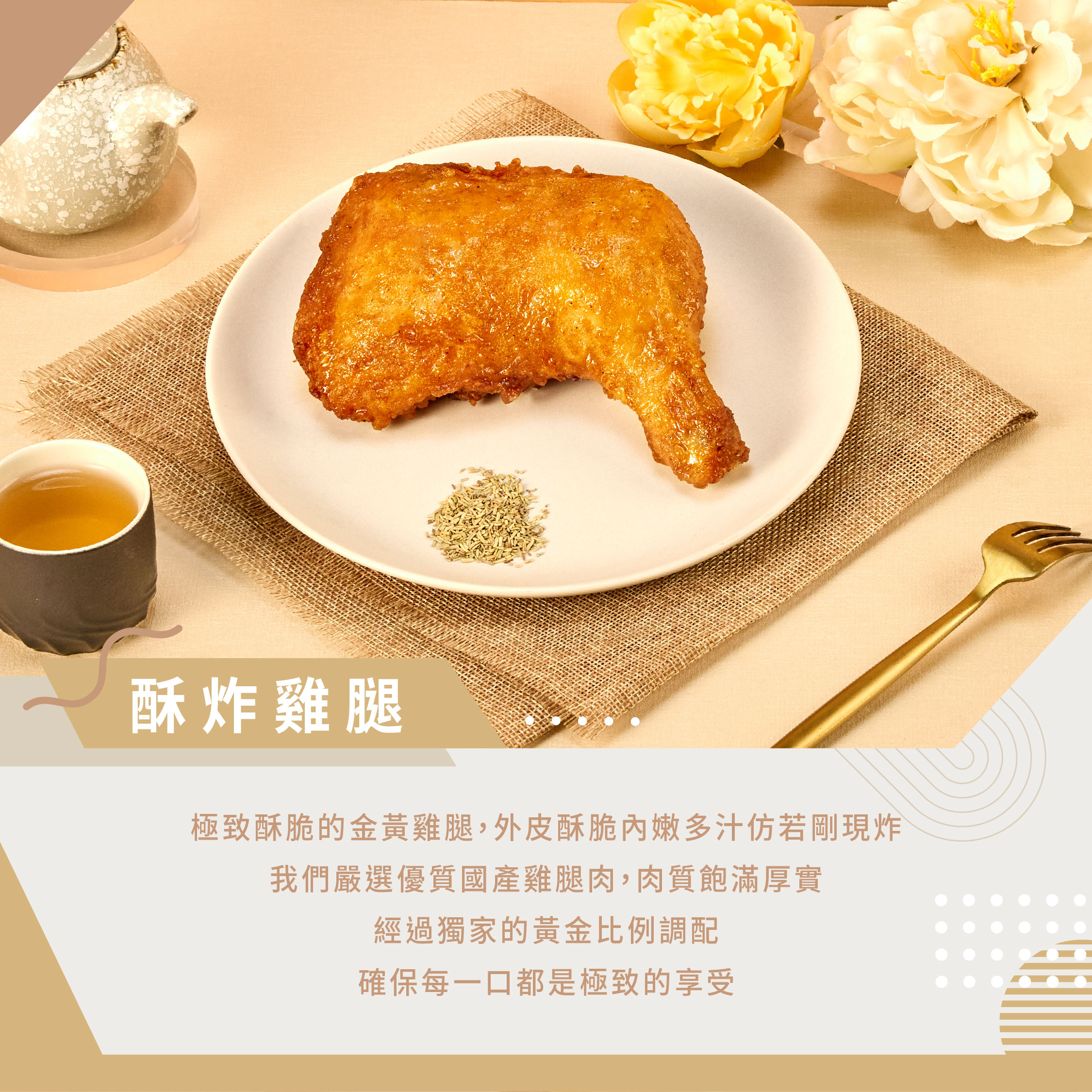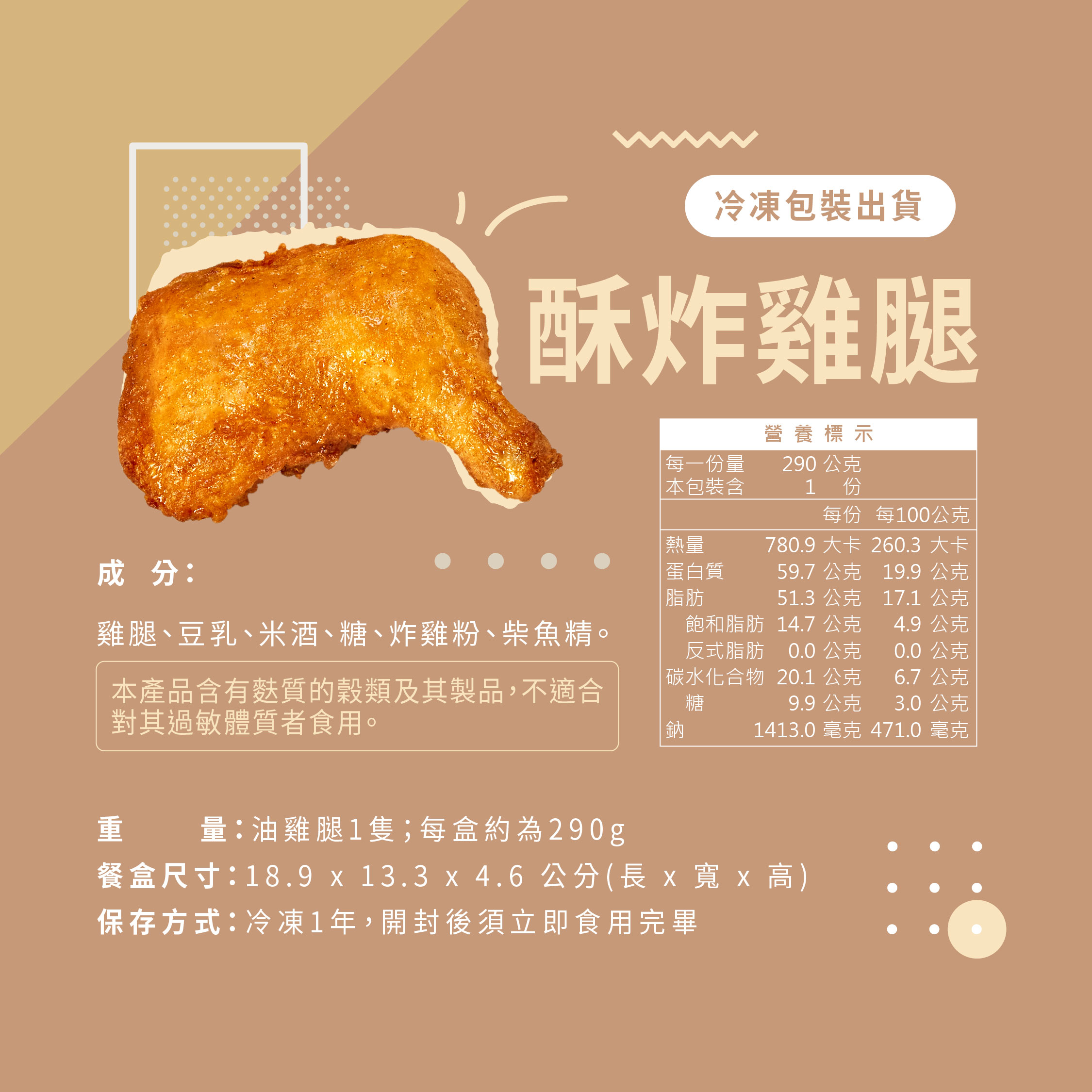 金黃雞腿外酥內嫩,多汁鮮甜仿若現炸嚴選國產氣冷雞腿肉,肉質飽滿厚實,獨家黃金比例裹粉酥炸,外層金黃酥脆,內層鮮嫩多汁簡單用電鍋、氣炸鍋加熱就能享受到酥脆美味的雞腿冊子彌月油飯知名大雞腿,加熱即食,適合忙碌的上班族、家庭主婦/主夫、學生、健身族群、外食族群