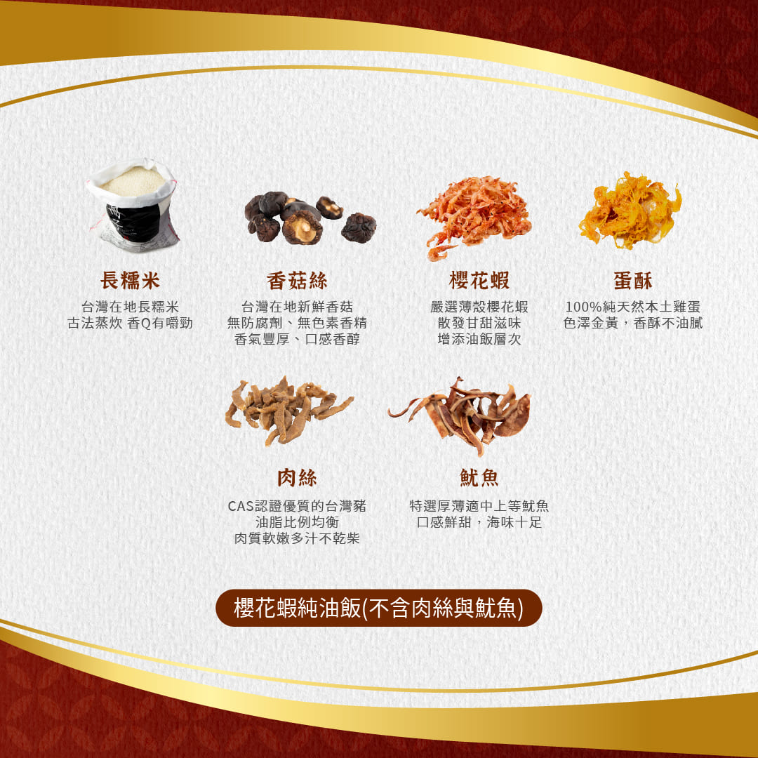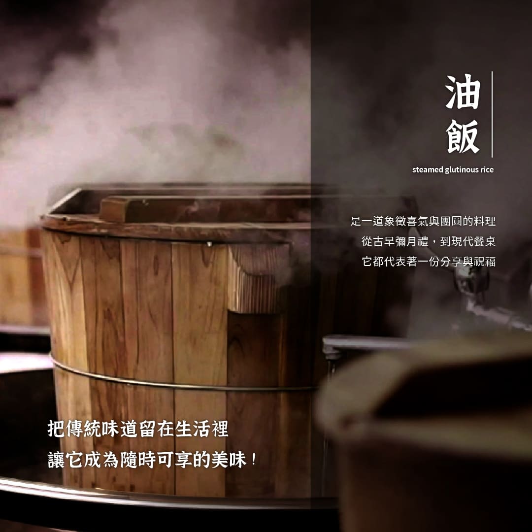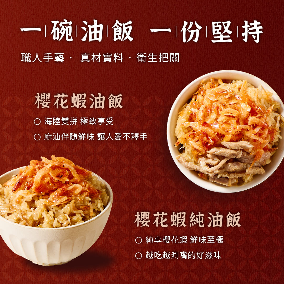 使用臺灣在地長糯米,粒粒香Q有嚼勁加入嚴選薄殼櫻花蝦,散發香濃甘甜滋味,增添油飯層次糯而不黏口感紮實,再加入麻油拌炒出濃厚米香