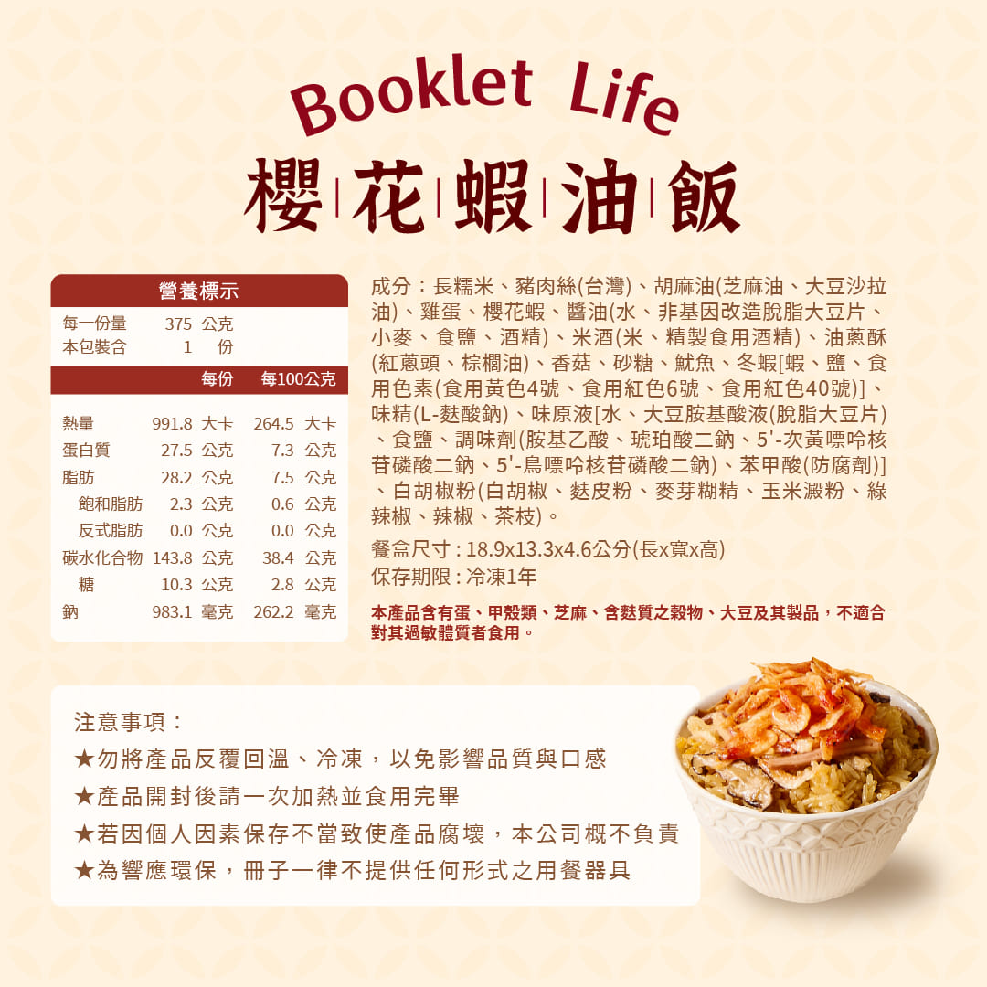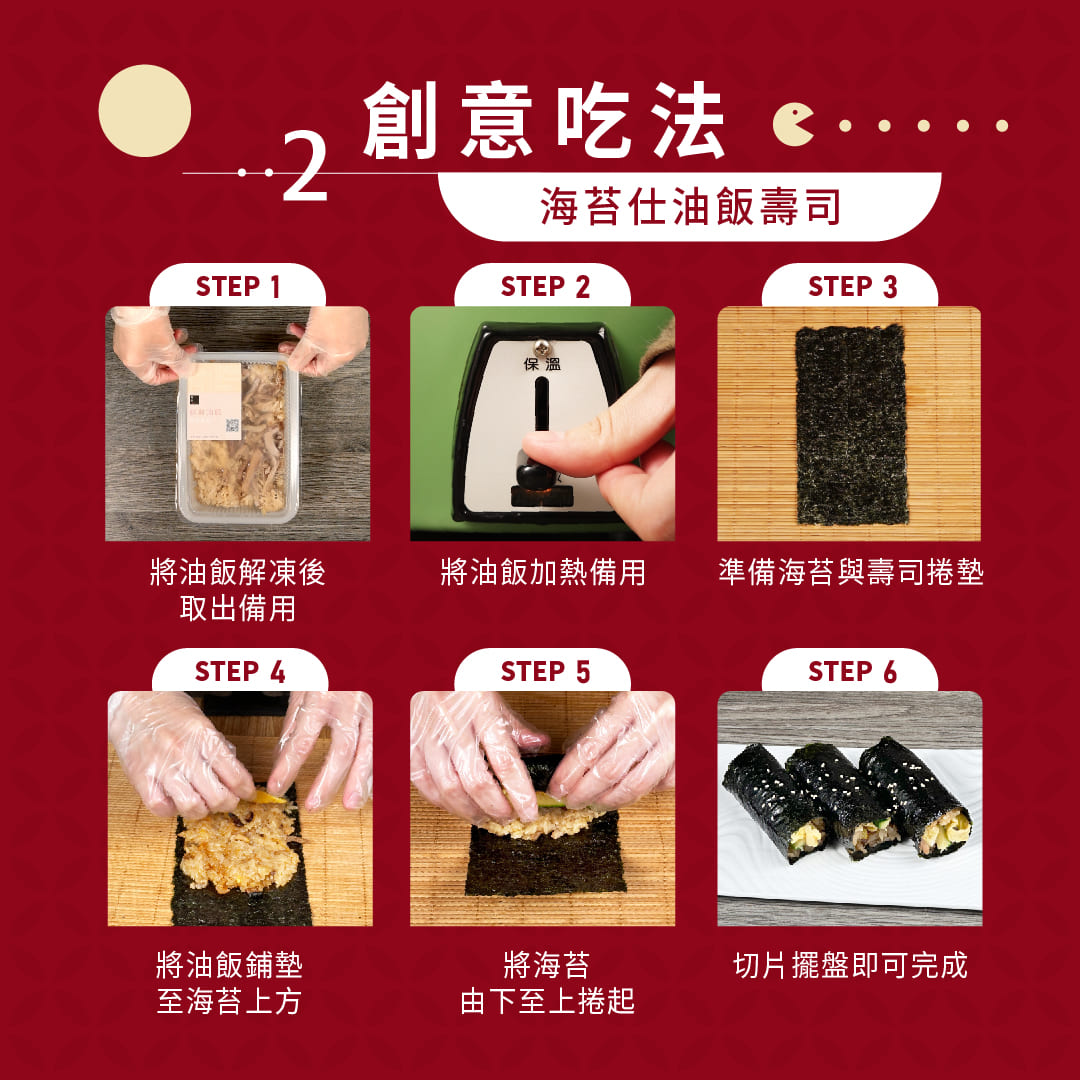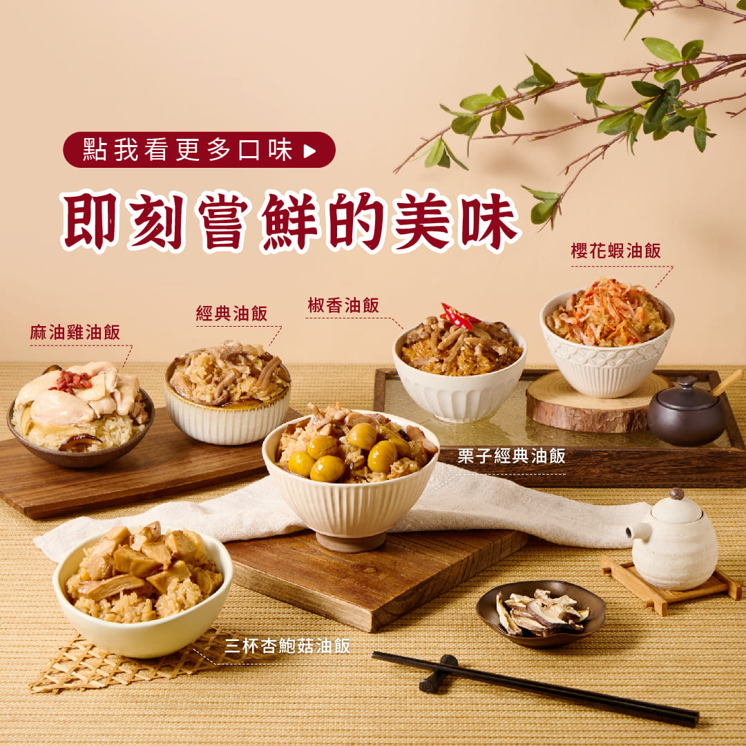 使用臺灣在地長糯米,粒粒香Q有嚼勁加入嚴選薄殼櫻花蝦,散發香濃甘甜滋味,增添油飯層次糯而不黏口感紮實,再加入麻油拌炒出濃厚米香