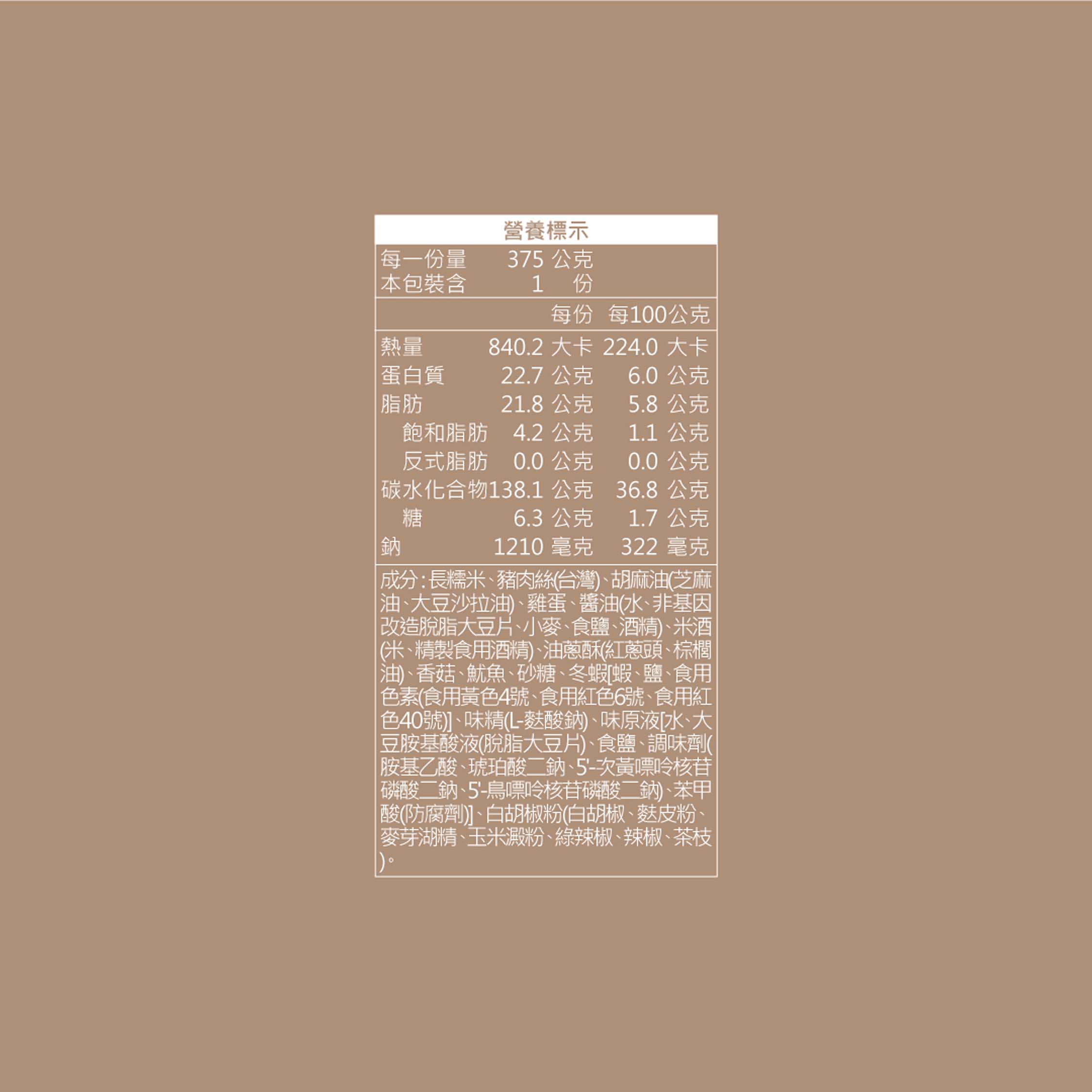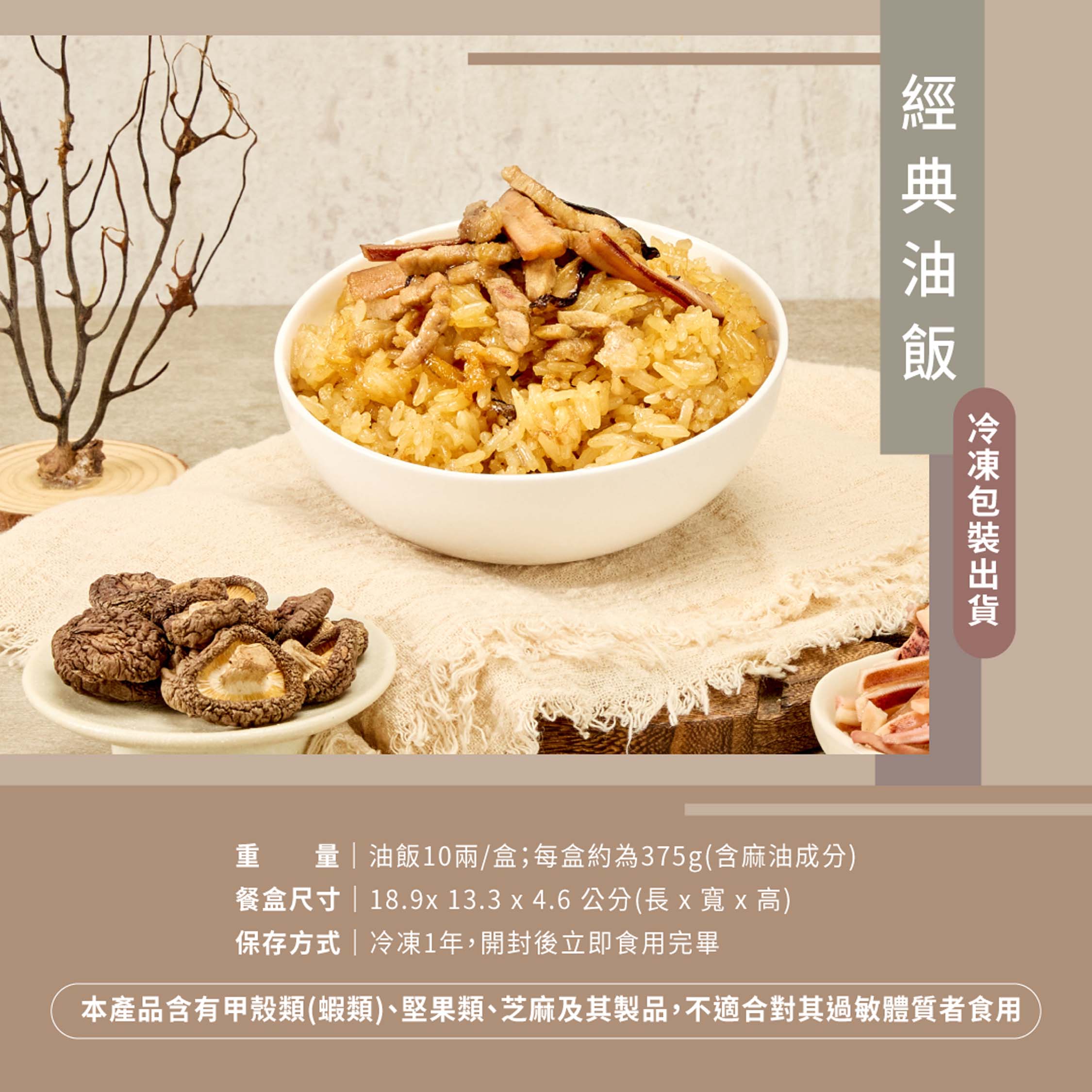 口口鮮香濃郁,讓人回味無窮的經典饗宴精選臺灣在地長糯米混以麻油厚工蒸炊,粒粒香Q有嚼勁以臺灣本產香菇、肉絲、魷魚、金鉤蝦、蛋酥拌炒香味撲鼻而來,讓人一口接一口吃不停的經典美味