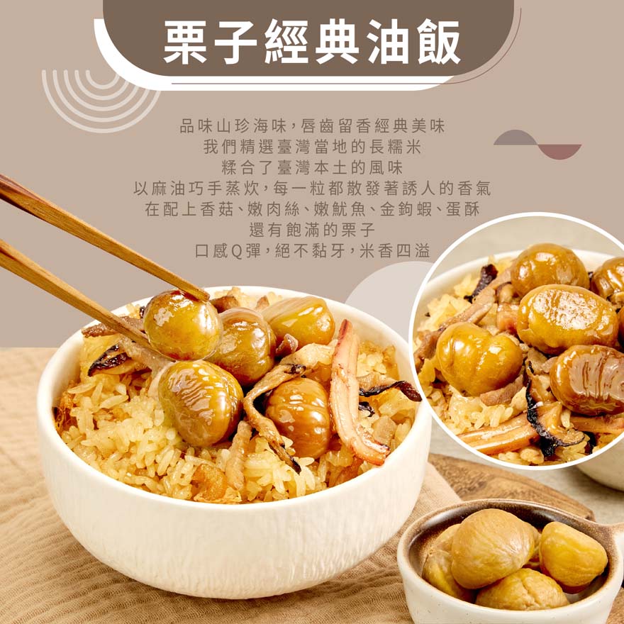 一口嚼進山珍海味,唇齒留香的經典美味精選臺灣在地長糯米混以麻油厚工蒸炊,粒粒香Q不黏牙、米香滿溢以臺灣本產香菇、肉絲、魷魚、金鉤蝦、蛋酥以及渾圓飽滿的栗子拌炒濃濃香味撲鼻而來,讓人一口接一口吃不停的經典美味