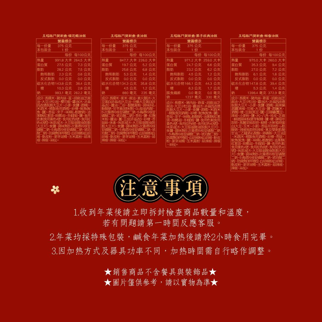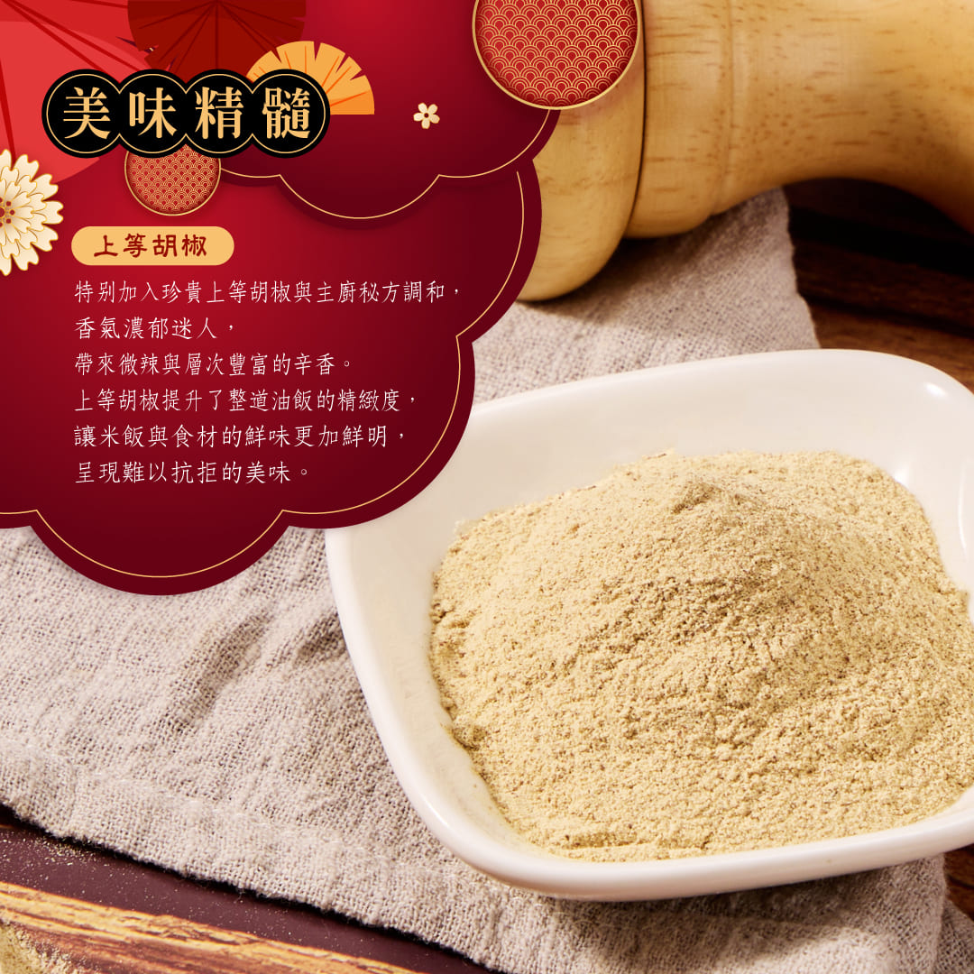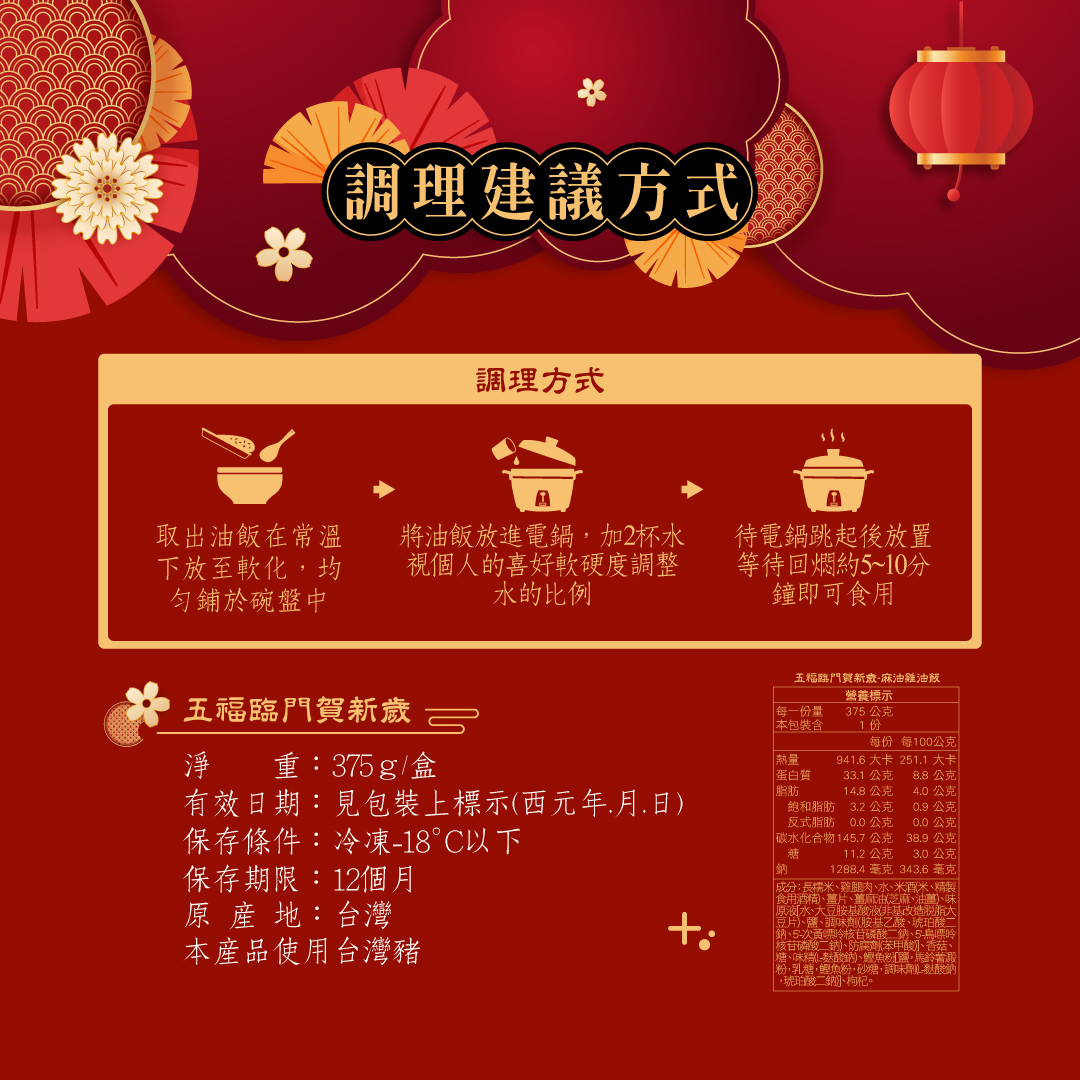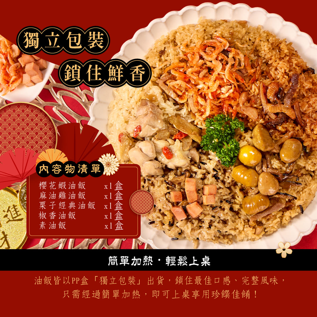 五福臨門賀新歲 — 寓意新年紅紅火火、步步高升、財源滾滾,是您團圓桌上不可或缺的幸福滋味。精選五款油飯,包含櫻花蝦油飯、麻油雞油飯、栗子經典油飯、椒香油飯、素油飯。匯聚了清香、椒香、甘甜與濃郁等多種口味,為您的年夜飯增添豐富層次。➺ 多種口味|一個套組5種口味,小孩子才做選擇➺ 油飯特色|嚴選在地長糯米,以傳統古法蒸炊,Q彈有嚼勁➺ 精心講究|每口味獨立分裝,簡單加熱即可