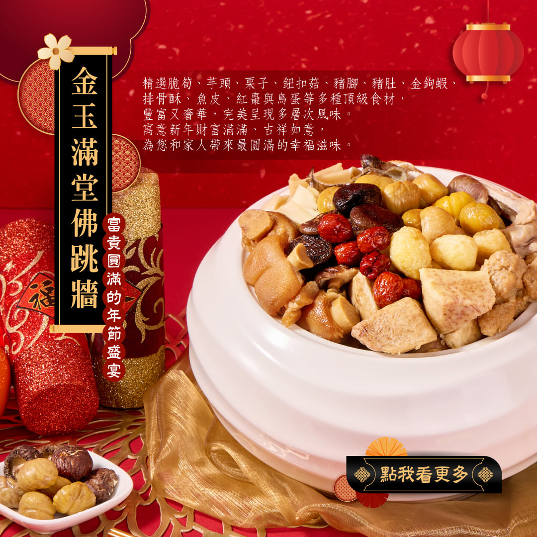 金玉滿堂佛跳牆 — 寓意新年財富滿滿、吉祥如意,為您和家人帶來最圓滿的幸福滋味🧧精選數十種的頂級食材,依食材特性以氽、蒸、炒、滷、炸、煨等工序細心處理,再煲以特製高湯,經長時間慢火熬製出甘醇濃郁、有層次的湯頭,主廚以精湛的料理工序,讓每樣食材保留獨有口感,同時也完美鎖住了高湯精華,輕咬一口,鮮香在口中散開更是迷人。➺ 真材實料|脆筍、芋頭、栗子、鈕扣菇、豬腳、豬肚、金鈎蝦、排骨酥、魚皮、紅棗與鳥蛋等➺ 特製湯底|繁雜工序與長時間地熬煮,品嘗出多層次的美味➺ 精心講究|以湯料分離的獨立包裝,鎖住最佳口感、完美風味