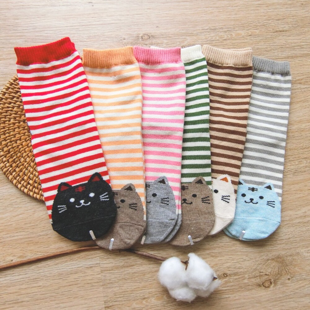 [Kaimei Cotton] 8 pairs of random excellent MIT Taiwan-made exquisite design pure cotton straight-cut women's socks striped cat style
