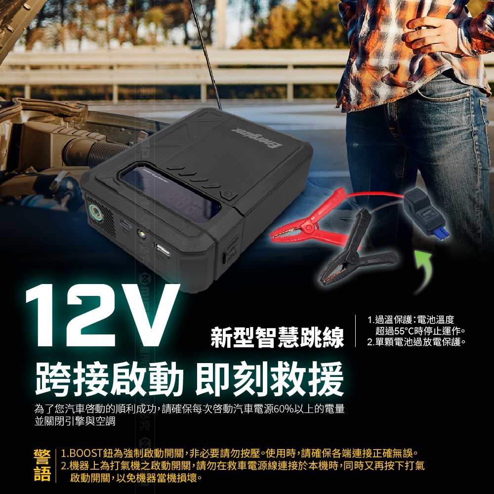 👍12V,300A啟動電流,峰值達1500A,可救援啟動6000CC以下汽車、3000CC以下柴油車。