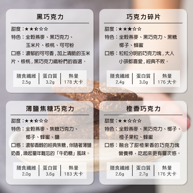 全麥穀物(全穀燕麥、全麥麵粉)、黑巧克力(糖、可可塊 、可可脂、無水乳脂、大豆卵磷 脂、天然香料)、轉化糖漿(蔗糖) 、麵粉、奶油(牛奶、鹽)、黑糖 、椰乾(椰子、偏亞硫酸氫鈉(抗氧化劑))、全雞蛋粉、複方膨脹劑(含碳酸氫鈉、酸性焦磷酸鈉)