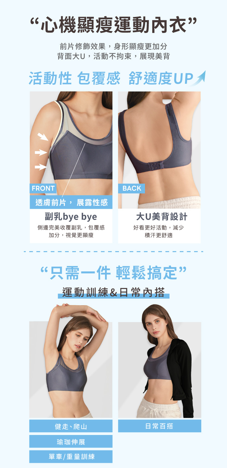 透膚前片設計,完美包覆副乳,視覺更顯瘦