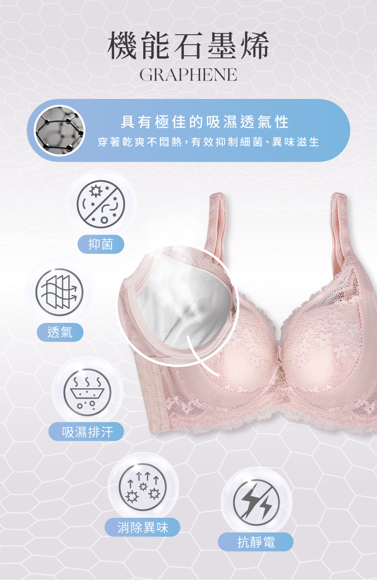 【Clany可蘭霓】 澎然升級 抑菌石墨烯軟鋼圈調整型BCD內衣|低脊心.集中包副乳.蕾絲內衣 8071-36裸灰粉