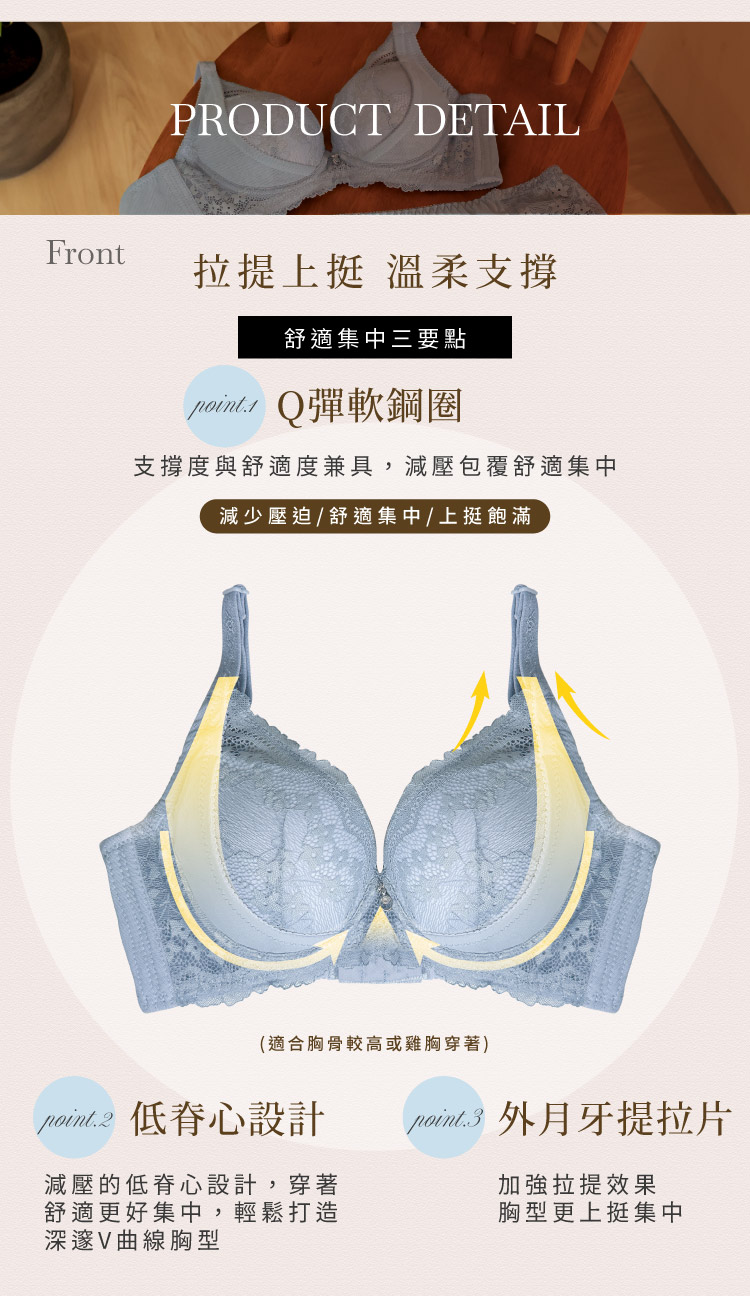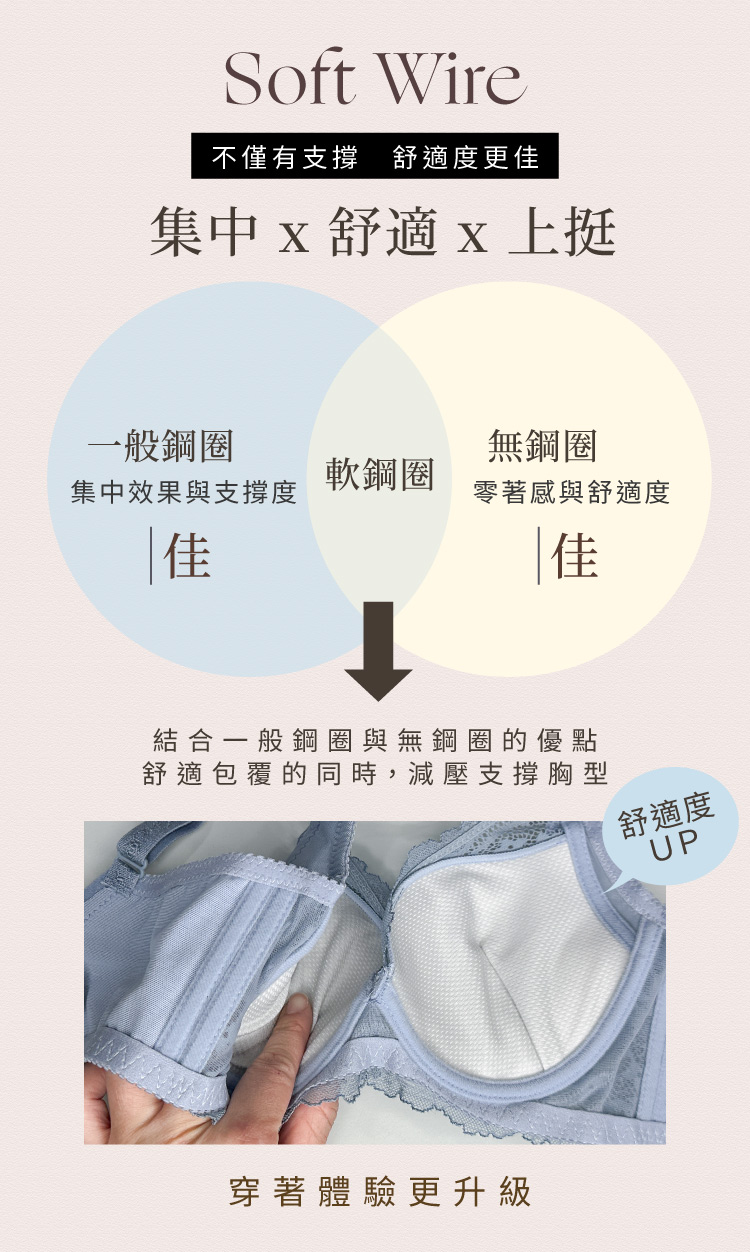 減壓Q軟鋼圈x低脊心,自然集中溫柔支撐