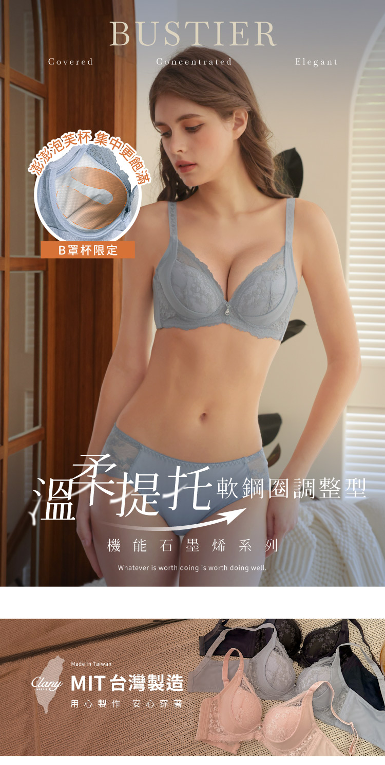 【Clany可蘭霓】 澎然升級 抑菌石墨烯軟鋼圈調整型BCD內衣|低脊心.集中包副乳.蕾絲內衣 8071-52 霧灰藍