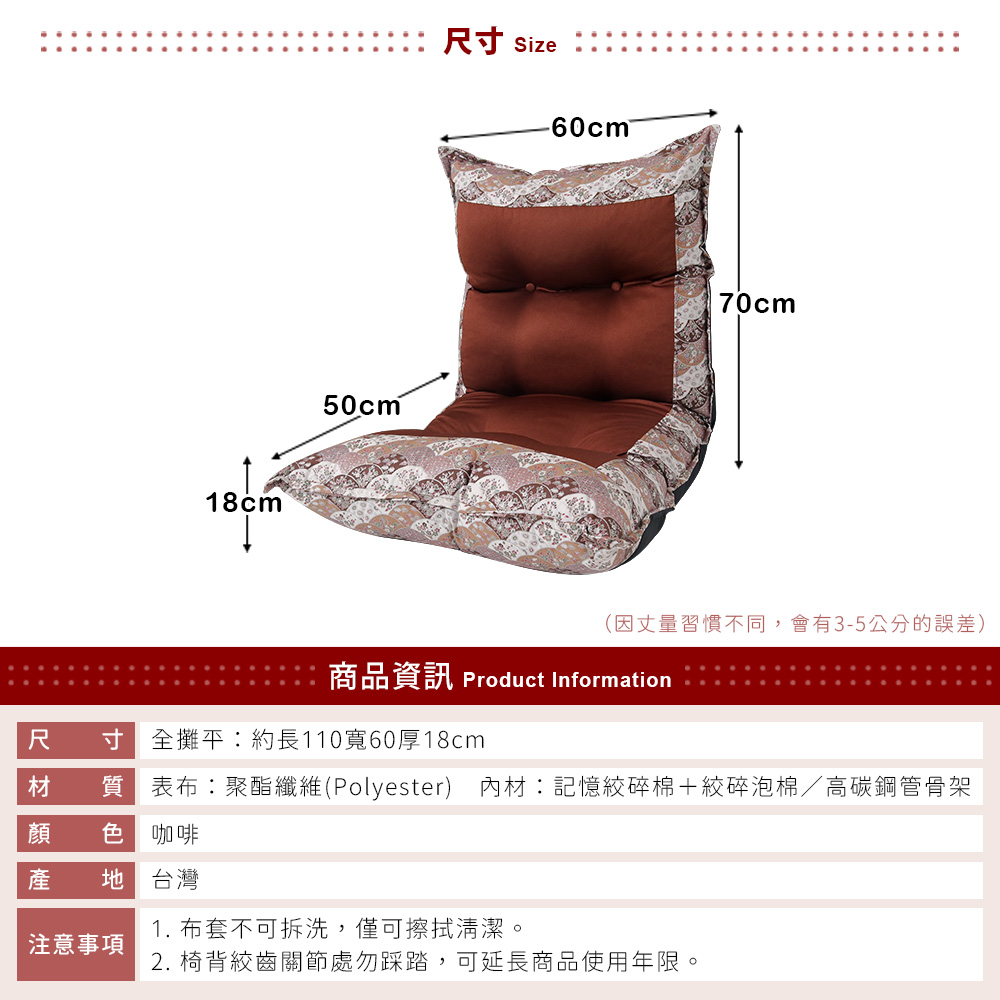●台灣製造●典雅拼布●高背加寬●外銷等級絞齒●多功能使用《 商品資訊 》★尺寸★-全攤平-長約110×寬約60公分㎝×厚約20㎝-和室椅-(椅背) 背寬約60㎝×背高約70㎝(椅坐) 坐深50㎝×坐寬約60㎝(以上規格為人工丈量會有微誤差約±2cm內)★重量★約5.6㎏(以上規格為人工丈量會有微誤差約±0.5kg內)★材質★(表布)聚酯纖維(Polyester)(內材)記憶絞碎棉+絞碎泡棉 高碳鋼管骨架★顏色★咖啡★產地★台灣/台南市 ※小叮嚀※1.表布不可拆洗,請以擦拭方式清潔2.椅背絞齒關節處請勿踩踏,可延長商品使用年限