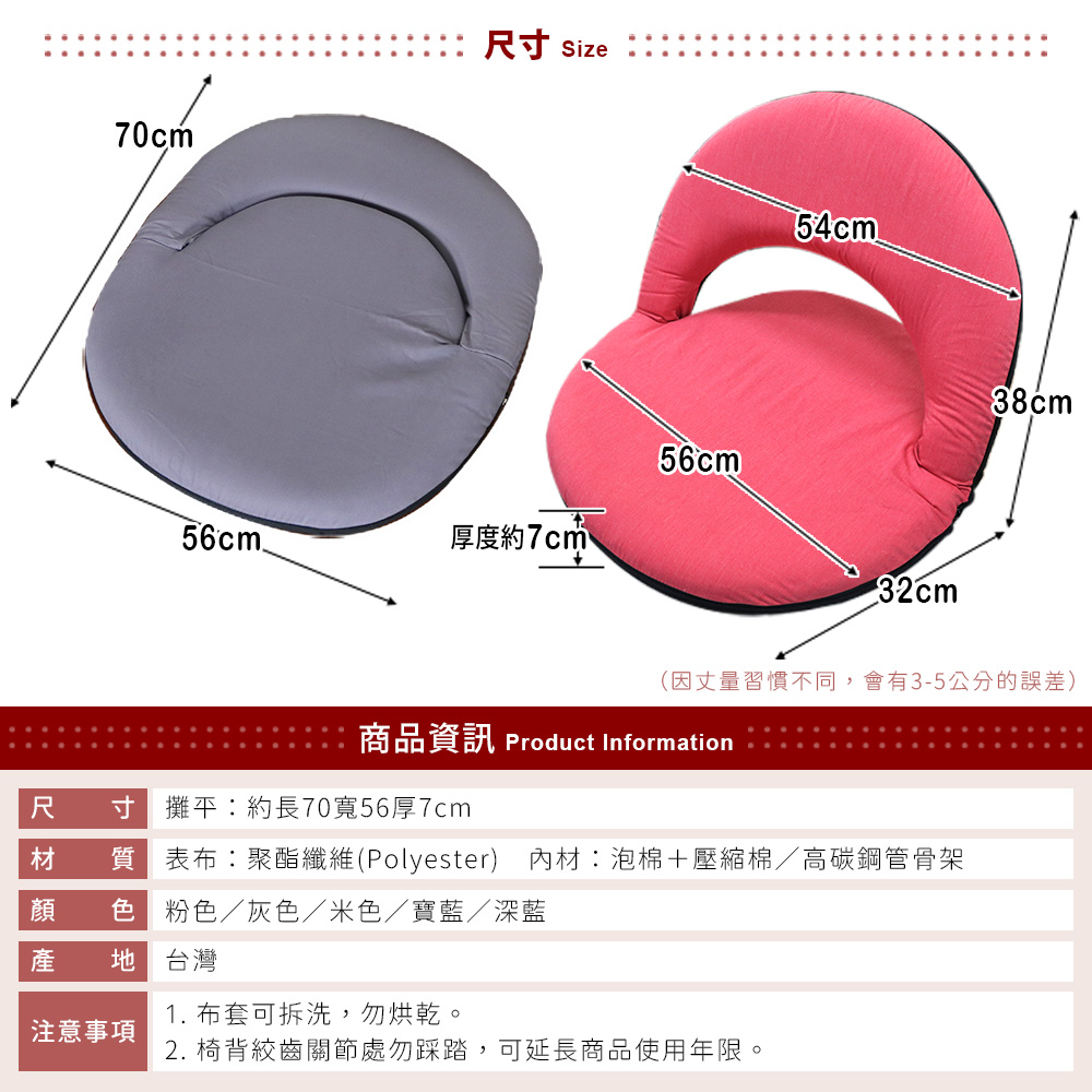 ████ 產品說明 ████◆ 椅背可做五段式調整◆ 採用外銷等級的專利絞齒,可大幅強化使用年限及安全.◆ 可攤平收納,不佔空間 ◆ 座椅底部加上專用抗括墊片,也不會傷害到地板表面◆ 台灣生產、製造████ 產品尺寸、材質 ████◆ 尺寸:(攤平)長約70× 寬約56 × 厚7公分(和室椅)椅背:高約34公分/寬約52公分椅坐:深約35公分/寬約52公分◆ 表布:TC傢俱布◆ 內材:泡棉+高碳鋼管骨架◆ 顏色:米色/粉色/灰色/深藍/寶藍◆ 重量:約3公斤【關於運費】
