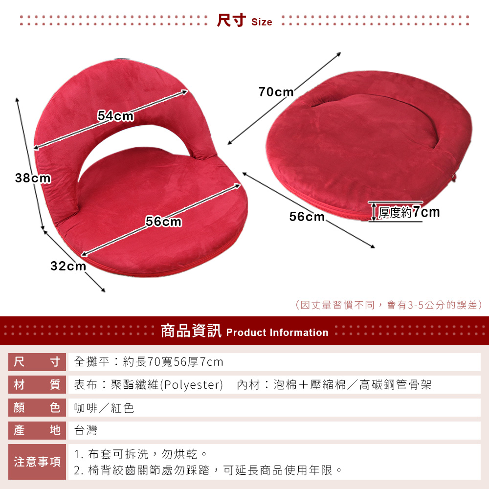 #和室椅#坐墊《台客嚴選》仿麂皮日式圓型和室椅████ 產品說明 ████◆ 椅背可做五段式調整◆ 採用外銷等級的專利絞齒,可大幅強化使用年限及安全.◆ 可攤平收納,不佔空間 ◆ 座椅底部加上專用抗括墊片,也不會傷害到地板表面◆ 台灣生產、製造████ 產品尺寸、材質 ████◆ 尺寸:(攤平)長約70× 寬約56 × 厚7公分(和室椅)椅背:高約32公分/寬約54公分椅坐:深約38公分/寬約56公分◆ 表布:仿麂皮布◆ 內材:泡棉+高碳鋼管骨架◆ 顏色:咖啡/紅色◆ 重量:約3公斤【關於運費】