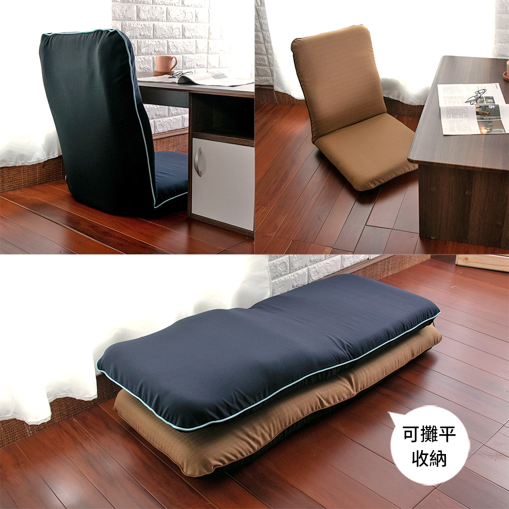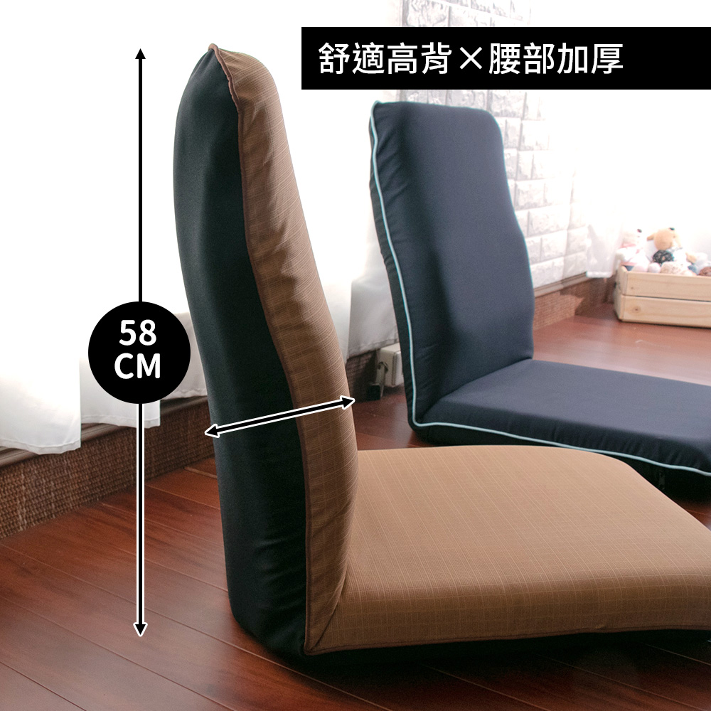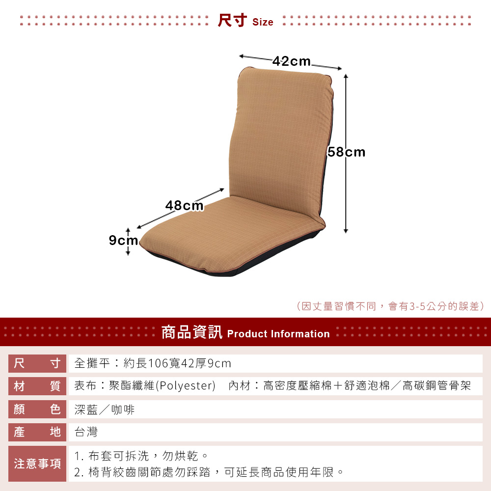 #台灣製 #可拆洗 #和室椅 #高背椅 #坐墊《 商品特色 》●台灣製造●舒適高背●腰部加墊,更貼合人體曲線 ●外銷等級專利絞齒●椅背可調,攤平收納不佔空間●底部抗刮墊片《 商品資訊 》★尺寸★攤平:長約106× 寬約42× 厚約9公分 背高:約58公分 背寬:約42公分 坐寬:約42公分 坐深:約48公分 (以上規格為人工丈量會有微誤差約±2cm內)★重量★約3.2kg(以上規格為人工丈量會有微誤差約±1kg內)★材質★(表布) 聚酯纖維(Polyester)(內材) 高碳鋼管骨架+高密度★顏色★深藍/咖啡★產地★台灣/台南市 ※小叮嚀※1.表布可拆洗,勿烘乾2.椅背絞齒關節處請勿踩踏,可延長商品使用年限※其他特殊注意事項: