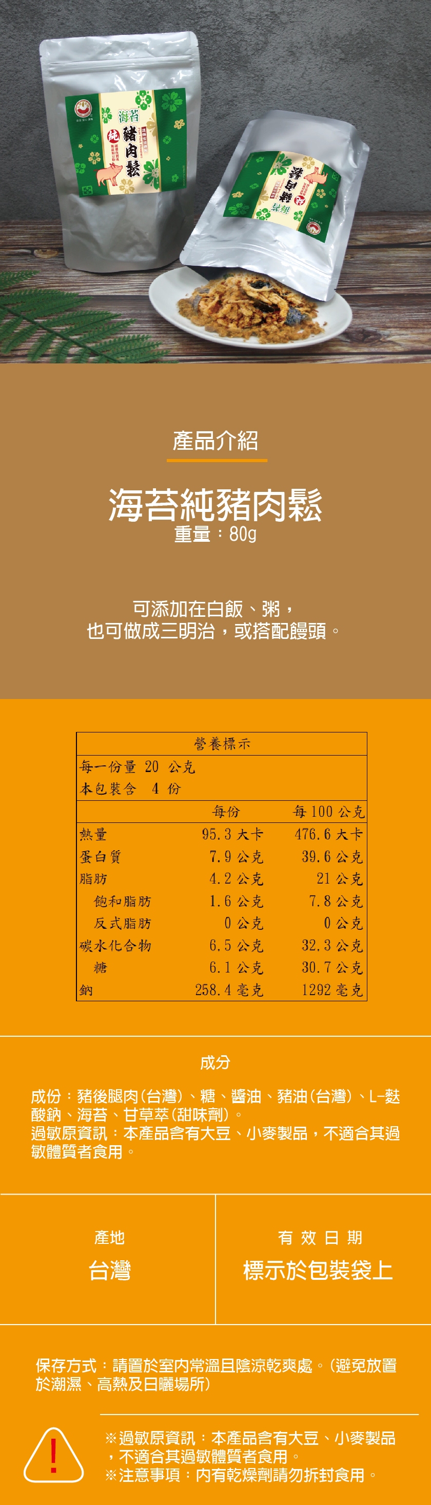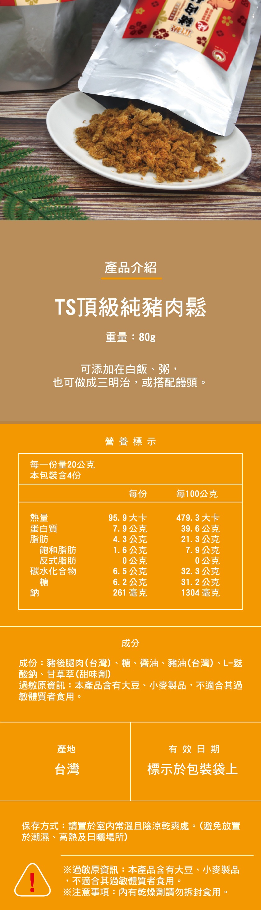 成份:豬後腿肉(台灣)、糖、醬油、豬油(台灣)、L-麩酸鈉、甘草萃(甜味劑) 過敏原資訊:本產品含有大豆、小麥製品,不適合其過敏體質者食用。
