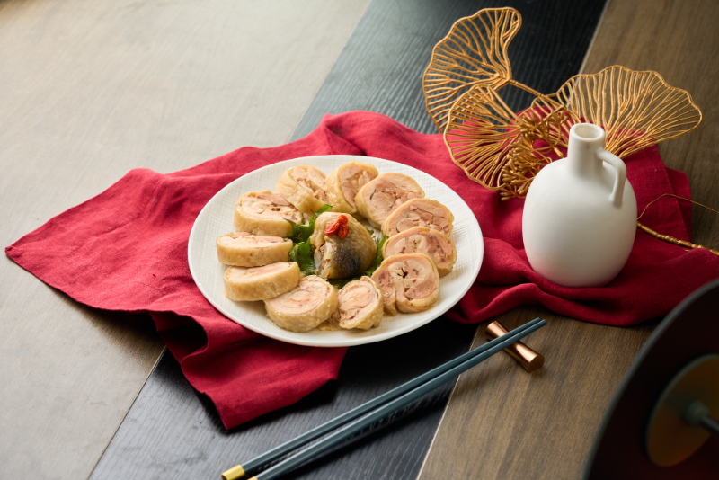 使用現宰去骨仿土雞腿手工捲,吃起來Q彈、有雞凍,帶著淡淡酒香,微微鹹甜,解凍切一切即可上桌