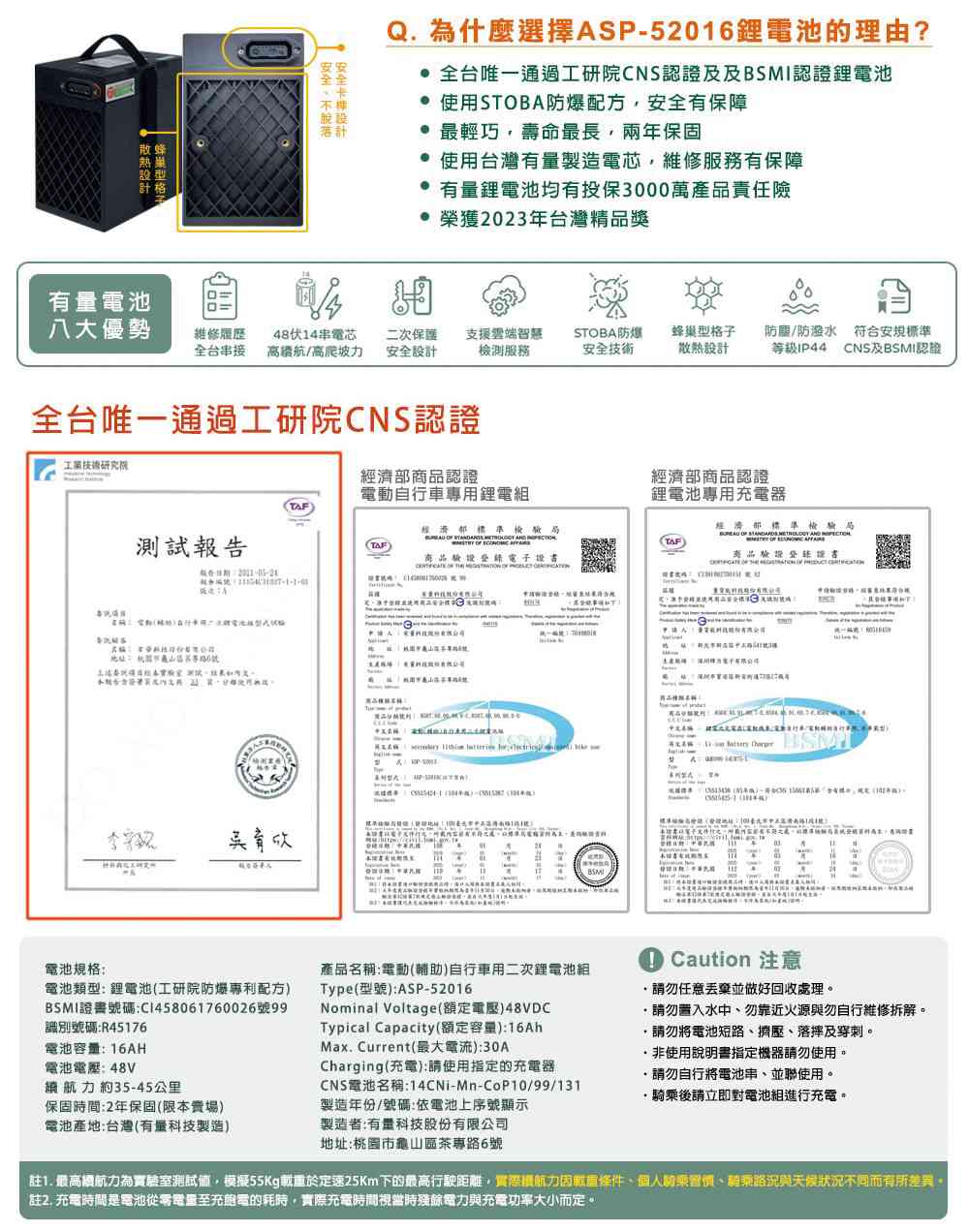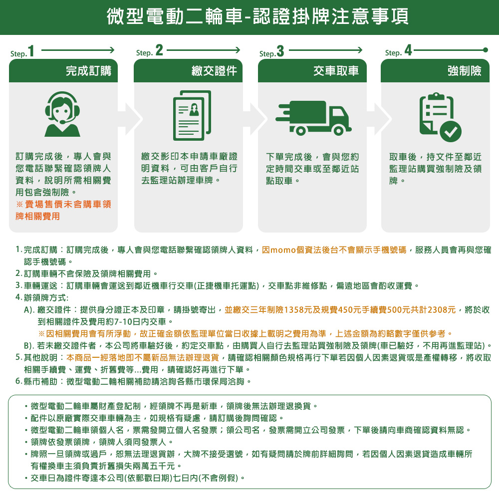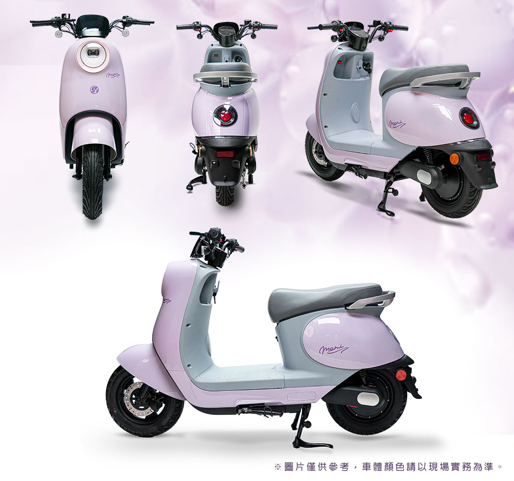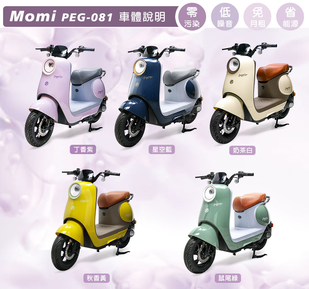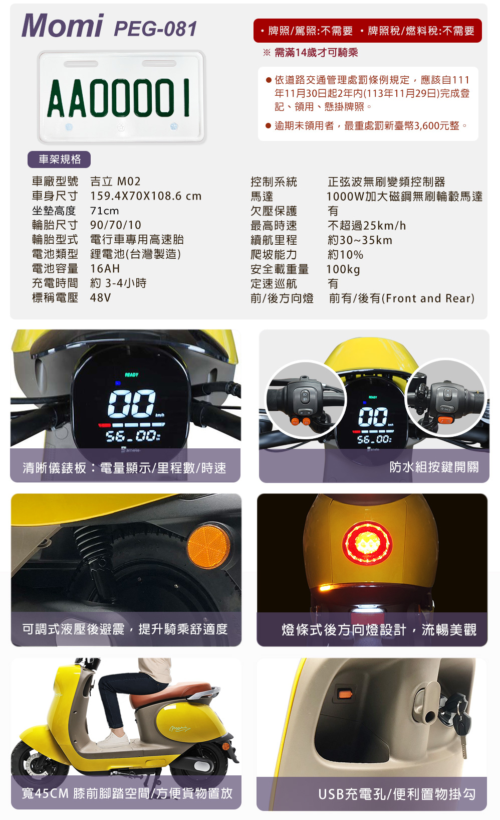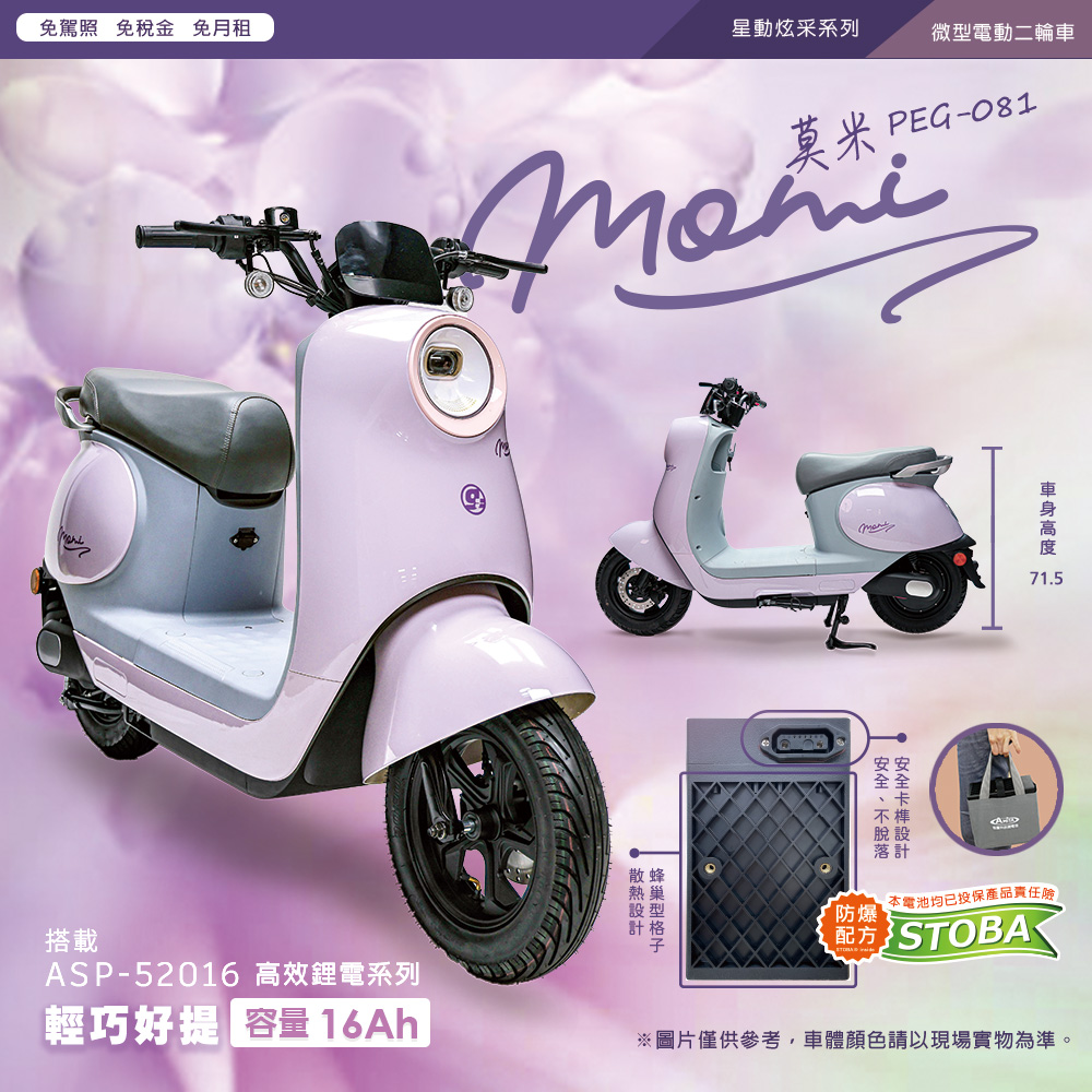 (車架)商品規格:車 型:Momi PEG-081車廠型號:吉立 M02車身尺寸:159.4*70*108.6 cm坐墊高度:71CM輪胎尺寸:90/70/10電池型式:鋰電池/台灣製造(工研院防爆專利配方)電池規格:48V16Ah使用電壓:110v-120v充電時間:4-6小時煞車系統:鼓剎系統及煞車斷電安全裝置控制系統:正弦波無刷變頻控制器馬達功率:1000W欠壓保護:有最高時速:不超過25km/h續航里程:約30~35km爬坡能力:約10%安全載重量:100kg定速巡航:有前/後方向燈:前有/後有備 註:續航力會隨著各種因素而變化,例如騎乘重量、坡度、路面情況等等,另外正常情況下電池會逐漸老化,也會影響續航力。(電池)商品規格電池類型:鋰電池(工研院防爆專利配方)BSMI證書號碼:CI458061760026號99識別號碼:R45176電池容量:16AH電池電壓:48V保固時間:2年保固(限本賣場)電池產地:台灣(有量科技製造)註1. 最高續航力為實驗室測試值,模擬55Kg載重於定速25Km下的最高行駛距離,實際續航力因載重條件、個人騎乘習慣、騎乘路況與天候狀況不同而有所差異。註2. 充電時間是電池從零電量至充飽電的耗時,實際充電時間視當時殘餘電力與充電功率大小而定。本商品標準配備:車體 X1保卡及說明書 X1鋰電池x1充電器X1(組)後視鏡X1(組)產品名稱:電動(輔助)自行車用二次鋰電池組Type(型號):ASP-52016Nominal Voltage(額定電壓):48VDCTypical Capacity(額定容量):16AhMax. Current(最大電流):30ACharging(充電):請使用指定的充電器CNS電池名稱:14CNi-Mn-CoP10/99/131製造年份/號碼:依電池上序號顯示製造者:有量科技股份有限公司地址:桃園市龜山區茶專路6號Caution注意:請勿任意丟棄並做好回收處理。請勿置入水中、勿靠近火源與勿自行維修拆解。請勿將電池短路、擠壓、落摔及穿刺。非使用說明書指定機器請勿使用。請勿自行將電池串、並聯使用。騎乘後請立即對電池組進行充電。保固適用地區:台灣本島所使用之本公司電動自行車。