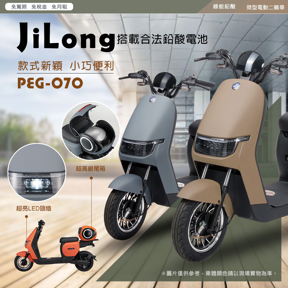 (車架)商品規格:車 型: PEG-070車身尺寸:170*69.5*105cm輪胎尺寸:3.00-10電池型式:鉛酸電池電池規格:48V15AH使用電壓:110v-120v充電時間:6-8小時煞車系統:鼓剎系統及煞車斷電安全裝置控制系統:正弦波電控無刷輪轂馬達最大功率:869.23W 欠壓保護:有最高時速:不超過25km/h續航里程:約20~25km爬坡能力:約10%安全載重量:100kg定速巡航:有前/後方向燈:前有/後有備 註:註1. 續航力會隨著各種因素而變化,例如騎乘重量、坡度、路面情況等等,另外正常情況下電池會逐漸老化,也會影響續航力。註2. 最高續航力為實驗室測試值,模擬55Kg載重於定速25Km下的最高行駛距離,實際續航力因載重條件、個人騎乘習慣、騎乘路況與天候狀況不同而有所差異。註3. 充電時間是電池從零電量至充飽電的耗時,實際充電時間視當時殘餘電力與充電功率大小而定。本商品標準配備:車體 X1保卡及說明書 X1鉛酸電池x1充電器X1(組)後視鏡X1(組)保固內容:以本車所提供之品質保證書內容條款詳述,鉛酸池保固六個月,車架、電機馬達、電子控制器、充電器、保固一年, 各項開關按鈕、轉把、喇叭、DC轉換器保固三個月,外殼塑件、燈泡、車胎、剎車皮屬消耗品無提供保固。 保固適用地區:台灣本島所使用之本公司電動自行車。