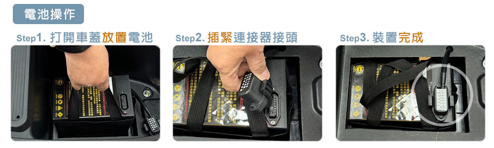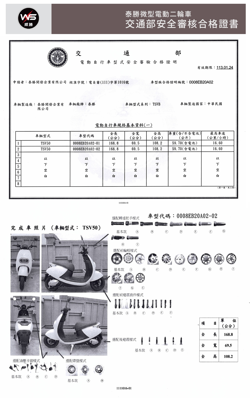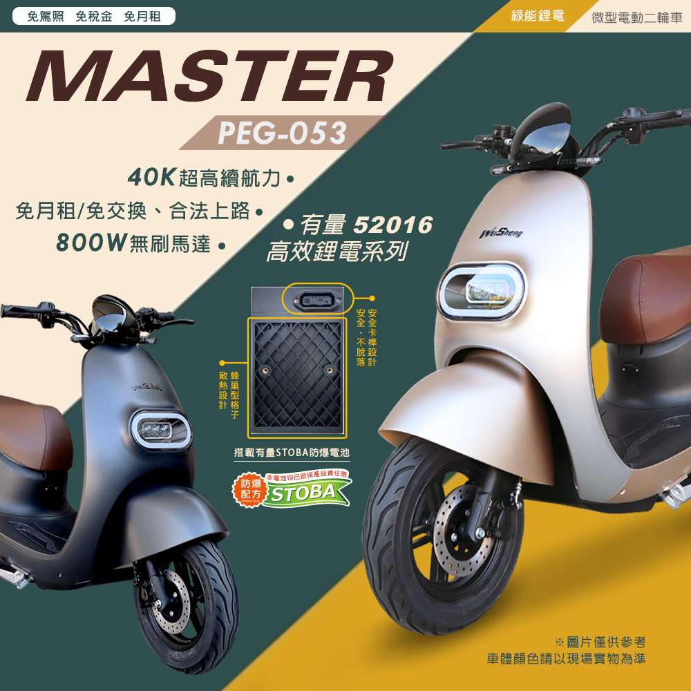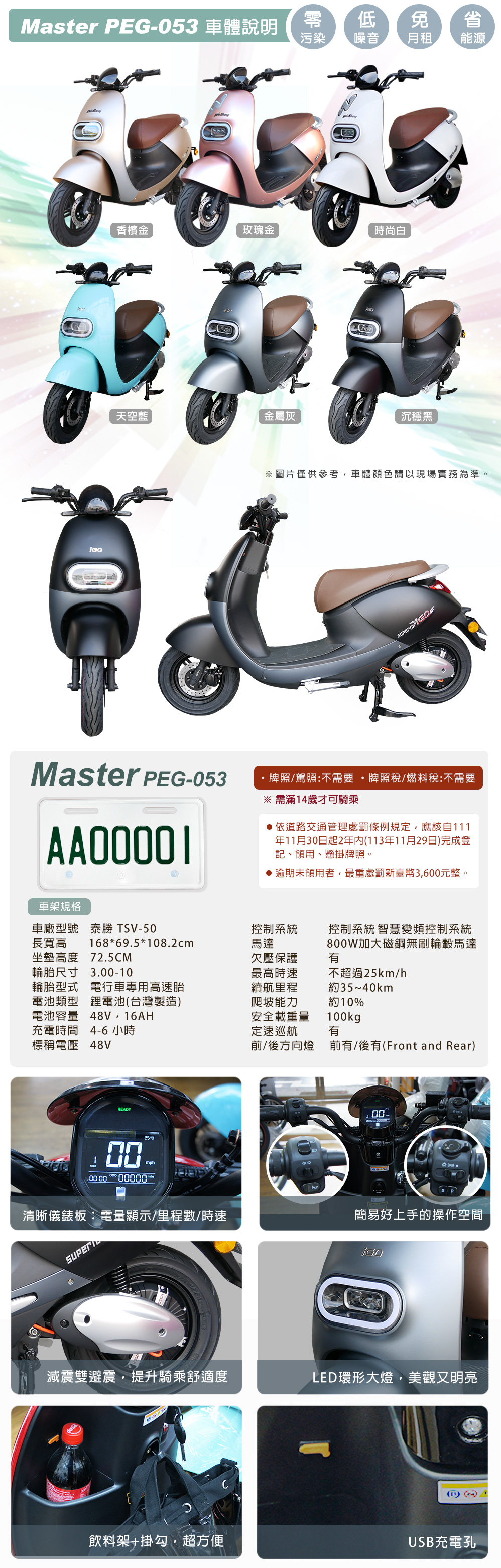 (車架)商品規格:車 型:Master PEG-053車廠型號:泰勝 TSV-50車身尺寸:168*69.5*108.2cm坐墊高度:72.5cm輪胎尺寸:3.00-10電池型式:鋰電池/台灣製造(工研院防爆專利配方)電池規格:48V16Ah使用電壓:110v-120v充電時間:4-6小時煞車系統:鼓剎系統及煞車斷電安全裝置控制系統:智慧變頻控制系統馬達功率:800W欠壓保護:有最高時速:不超過25km/h續航里程:約35~40km爬坡能力:約10%安全載重量:100kg定速巡航:有前/後方向燈:前有/後有備 註:續航力會隨著各種因素而變化,例如騎乘重量、坡度、路面情況等等,另外正常情況下電池會逐漸老化,也會影響續航力。(電池)商品規格:電池類型:鋰電池(工研院防爆專利配方)電池容量:16AH電池電壓:48V保固時間:2年保固(限本賣場)電池產地:台灣(有量科技製造)註1. 最高續航力為實驗室測試值,模擬55Kg載重於定速25Km下的最高行駛距離,實際續航力因載重條件、個人騎乘習慣、騎乘路況與天候狀況不同而有所差異。註2. 充電時間是電池從零電量至充飽電的耗時,實際充電時間視當時殘餘電力與充電功率大小而定。產品名稱:電動(輔助)自行車用二次鋰電池組Type(型號):ASP-52016Nominal Voltage(額定電壓):48VDCTypical Capacity(額定容量):16AhMax. Current(最大電流):30ACharging(充電):請使用指定的充電器CNS電池名稱:14CNi-Mn-CoP10/99/131製造年份/號碼:依電池上序號顯示製造者:有量科技股份有限公司地址:桃園市龜山區茶專路6號BSMI證書號碼:CI458061760026號99識別號碼:R45176本商品標準配備:車體 X1保卡及說明書 X1鋰電池x1充電器X1後視鏡X1(組)1年保固期保固內容:以本車所提供之品質保證書內容條款詳述,鋰電池保固兩年(只限本賣場),車架、電機馬達、電子控制器、充電器、保固一年, 各項開關按鈕、轉把、喇叭、DC轉換器保固三個月,外殼塑件、燈泡、車胎、剎車皮屬消耗品無提供保固。 保固適用地區:台灣本島所使用之本公司電動自行車。