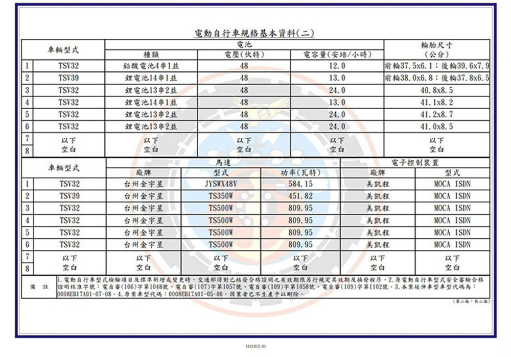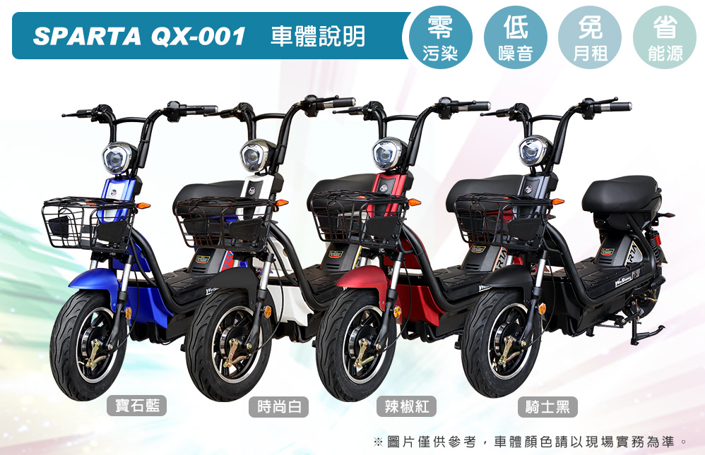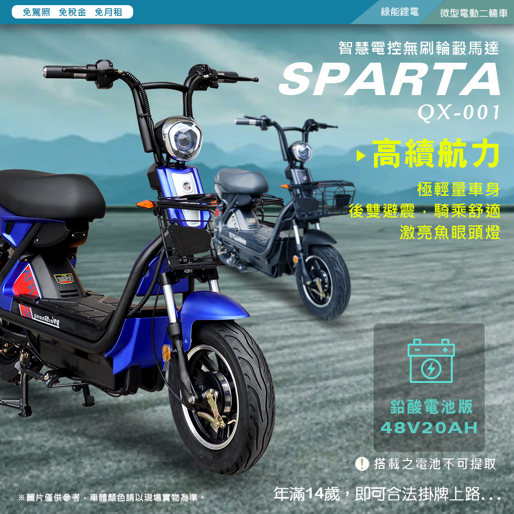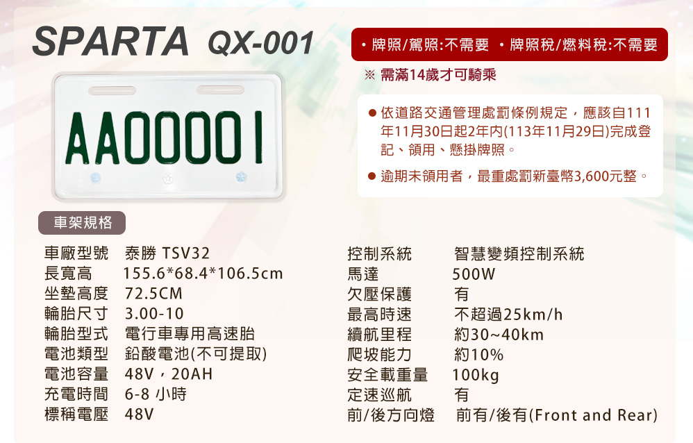 (車架)商品規格:車 型:SPARTA QX-001車廠型號:泰勝 TSV32車身尺寸:155.6*68.4*106.5cm坐墊高度:72.5CM輪胎尺寸:3.00-10電池型式:鉛酸電池(不可提取)電池規格:48V20Ah(6個月保固)使用電壓:110v-120v充電時間:6-8小時煞車系統:鼓剎系統及煞車斷電安全裝置控制系統:智慧變頻控制系統馬達功率:500W欠壓保護:有最高時速:不超過25km/h續航里程:約30~40km爬坡能力:約10%安全載重量:100kg定速巡航:有前/後方向燈:前有/後有備 註:續航力會隨著各種因素而變化,例如騎乘重量、坡度、路面情況等等,另外正常情況下電池會逐漸老化,也會影響續航力。(電池)商品規格:電池類型: 鉛酸電池(無法提取)識別號碼:R65387電池容量: 48V20AH電池電壓: 48V保固時間:6個月保固註1. 最高續航力為實驗室測試值,模擬55Kg載重於定速25Km下的最高行駛距離,實際續航力因載重條件、個人騎乘習慣、騎乘路況與天候狀況不同而有所差異。註2. 充電時間是電池從零電量至充飽電的耗時,實際充電時間視當時殘餘電力與充電功率大小而定。本商品標準配備:車體 X1保卡及說明書 X1鉛酸電池x1充電器X1後視鏡X1(組)Caution注意:請勿任意丟棄並做好回收處理。請勿置入水中、勿靠近火源與勿自行維修拆解。請勿將電池短路、擠壓、落摔及穿刺。非使用說明書指定機器請勿使用。請勿自行將電池串、並聯使用。騎乘後請立即對電池組進行充電。1年保固期保固內容:以本車所提供之品質保證書內容條款詳述,鋰電池保固兩年(只限本賣場),車架、電機馬達、電子控制器、充電器、保固一年, 各項開關按鈕、轉把、喇叭、DC轉換器保固三個月,外殼塑件、燈泡、車胎、剎車皮屬消耗品無提供保固。 保固適用地區:台灣本島所使用之本公司電動自行車。
